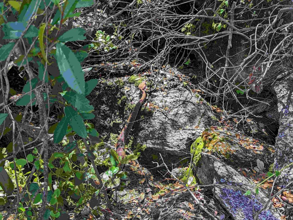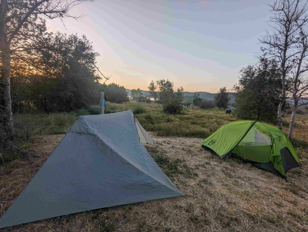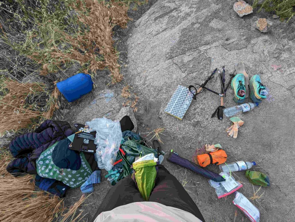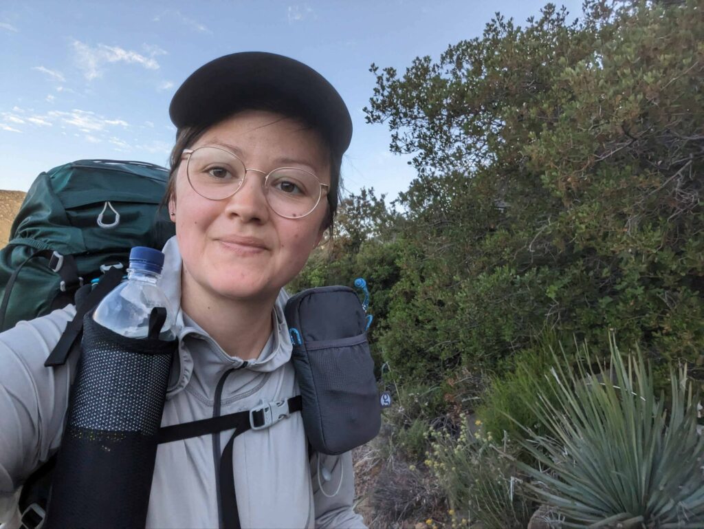 Schon kurz nach dem 1-Meilen-Schild sehen wir eine Klapperschlange. Ganz langsam schiebt sie sich über den Weg. Leider hat sie nicht gerasselt. Wir wandern bis zu einer Wasserstelle bei Meile 6,6 und füllen die Wasservorräte auf. Ich bin schon ganz schön kaputt und spüre erste Blasen. Das kann ja was werden. Kurze 1,1 Meilen später ist es schon 18 Uhr und wir finden einen wunderschönen Campingplatz mit Aussicht auf unseren Startpunkt. Essen gibt es im Dunkeln. Die Jungs haben in der Hikerbox eine 1kg Packung Nudeln gefunden und bereiten diese zu. Mit Brie-Käse und Tomatensauce aus der Dose. Ich glaube, Ultra-light geht anders. Harry hat außerdem eine Tüte mit vielen Gewürzen gefunden, die er fröhlich in seiner Pasta verteilt. Er trägt außerdem eine Ukulele und Poi-Bälle in seinem 19kg Rucksack. Die erste Nacht schlafe ich herrlich. Sie endet 5 Uhr morgens als Constant sein Zelt abbaut. Halb 6 ist er mit dem Sonnenaufgang abmarschbereit. Wir verabschieden uns, denn wir werden uns sicher nicht wiedersehen. Die Jungs sind einfach viel schneller.