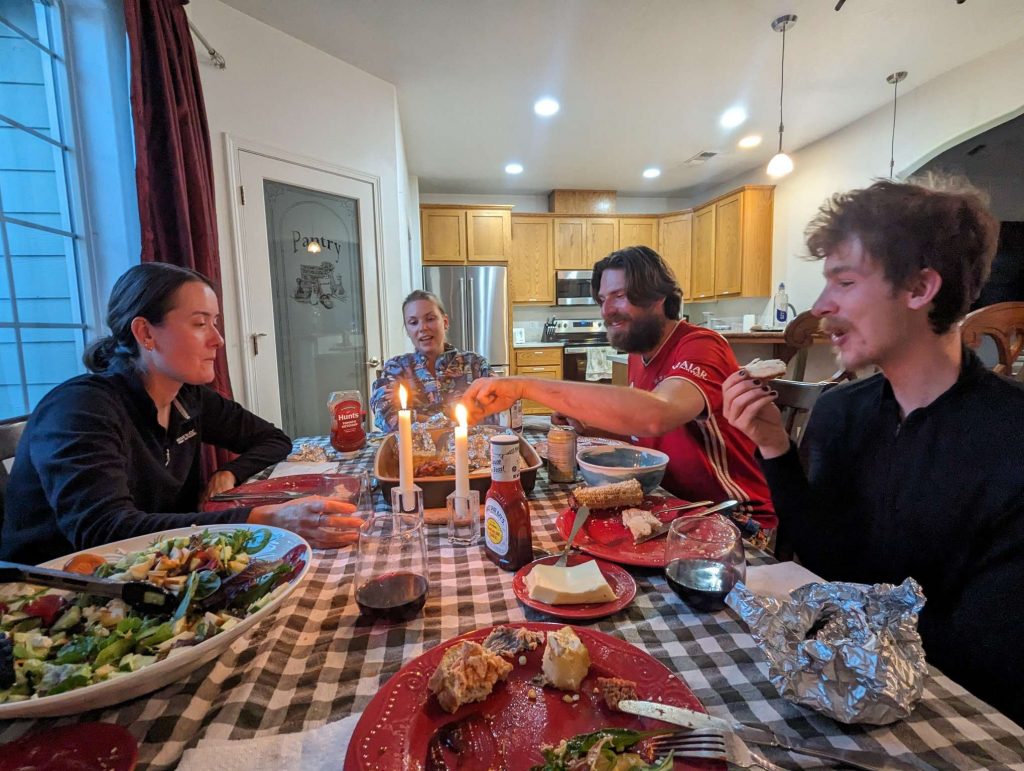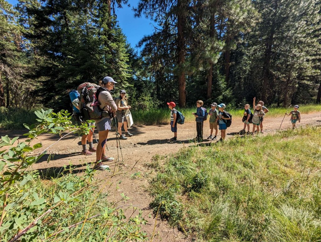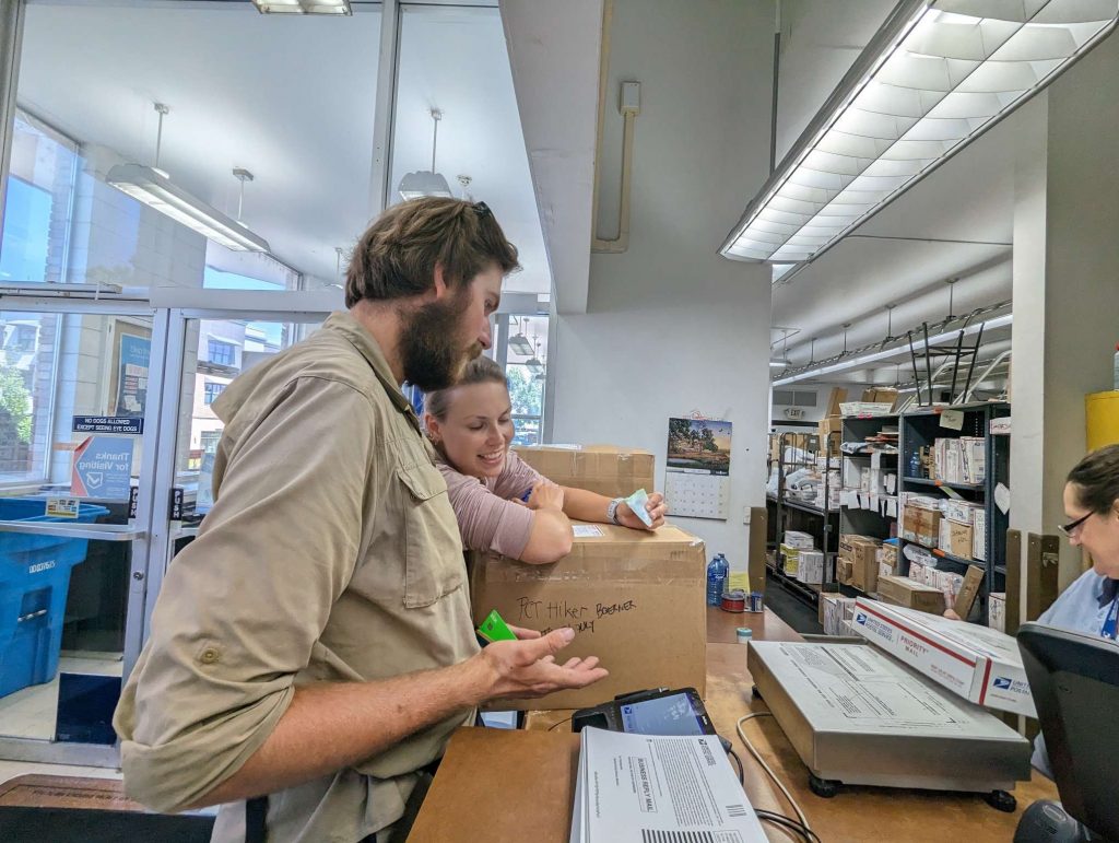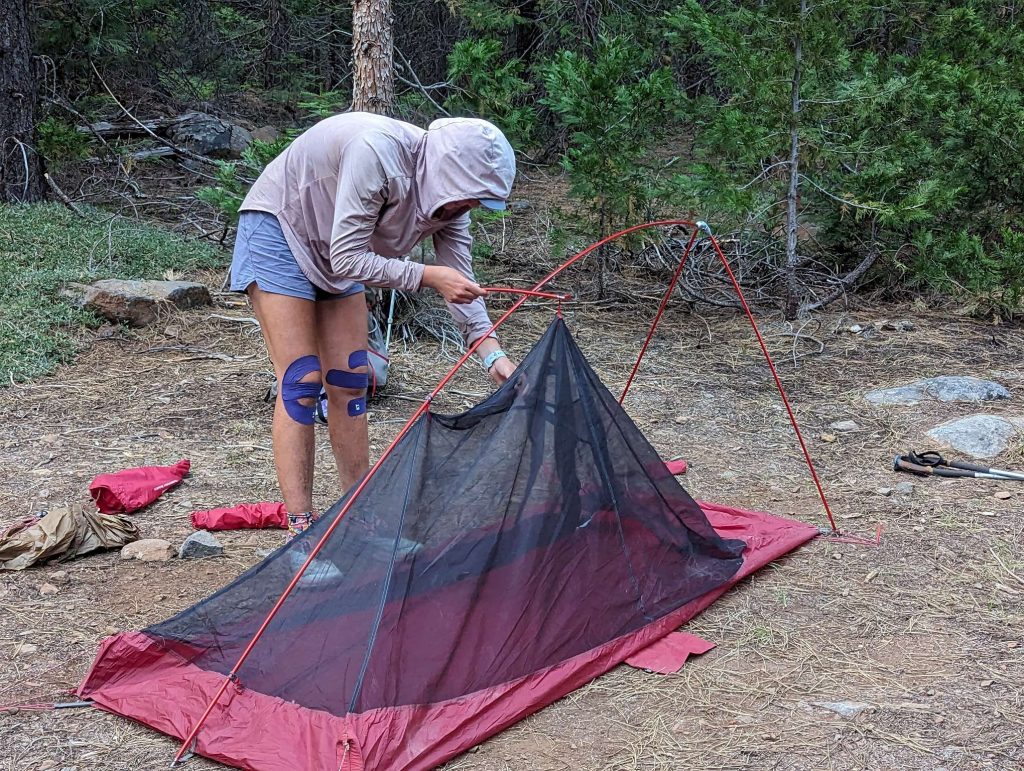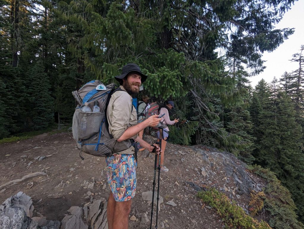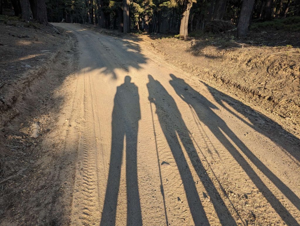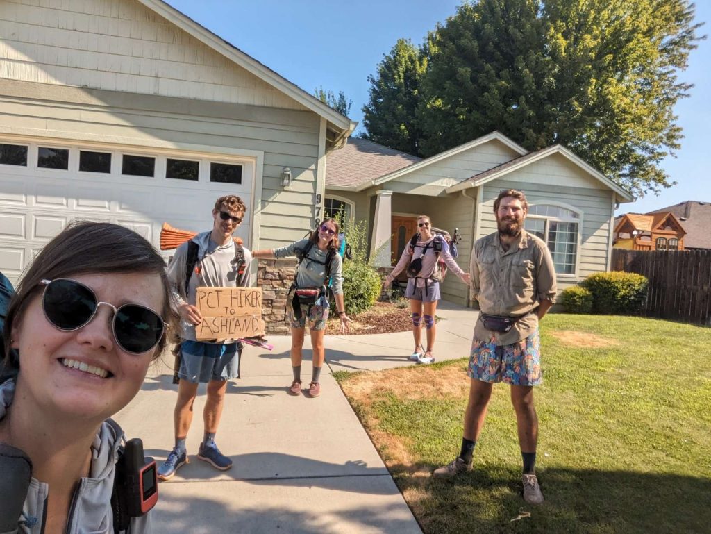 Die Auszeit ist vorbei. Wir packen und räumen auf. Als wir schon mit fertig gepackten Rucksäcken vor der Tür warten, liegen Eduardos Sachen noch immer überall verstreut. Wir meckern wie große Schwestern rum und versuchen, seine Packerei etwas zu beschleunigen. Dann gilt es, aus dem Vorort eine Mitfahrgelegenheit zu bekommen. Skeptisch laufen wir zur nächsten Hauptstraße, bereit ein Uber zu rufen. Wir stehen noch nicht mal und da hält schon ein Auto an. Tina aus Ashland nimmt uns mit. Super! In der Post stopfen wir unsere Resupplies in Kartons und hiefen die Pakete auf den Tresen (23kg Essen – 4 Personen, 5 Tage). Tina bietet uns an, uns auch noch zum Trailhead zu fahren. Das nehmen wir dankbar an. Nun geht es wieder los. Ich fühle mich ziemlich erholt, aber mir scheint, meine Muskeln haben das Wandern verlernt. Wir schniefen und kämpfen uns knallrot den Hügel hoch. Schon nach 15km beschließen wir zu campen. Beim Zeltaufbau ertönt lautes dänisches Fluchen. Clumsys reparierte Zeltstange (Verbindungsstück) bricht wieder. Sie unwickelt die Stelle mit Panzertape. Es sieht etwas ulkig aus, aber hält erstaunlicherweise. Eduardo schleicht vorbei – er ist einige Meilen in die falsche Richtung gelaufen. Hat wohl vergessen, dass wir ab jetzt wieder nordwärts unterwegs sind. Er will noch weitergehen, damit er länger schlafen kann. Nach dem Abendessen machen wir Planks. Für Oregon haben wir uns vorgenommen, jeden Tag ein paar Sekunden länger durchzuhalten. Mal sehen. Nachts kommt ein – den Geräuschen nach zu urteilen – sehr großes Tier vorbei und schnieft laut. Ich liege mit klopfenden Herzen wach und warte, was passiert. Das Tier geht aber nur vorbei. Glück gehabt.