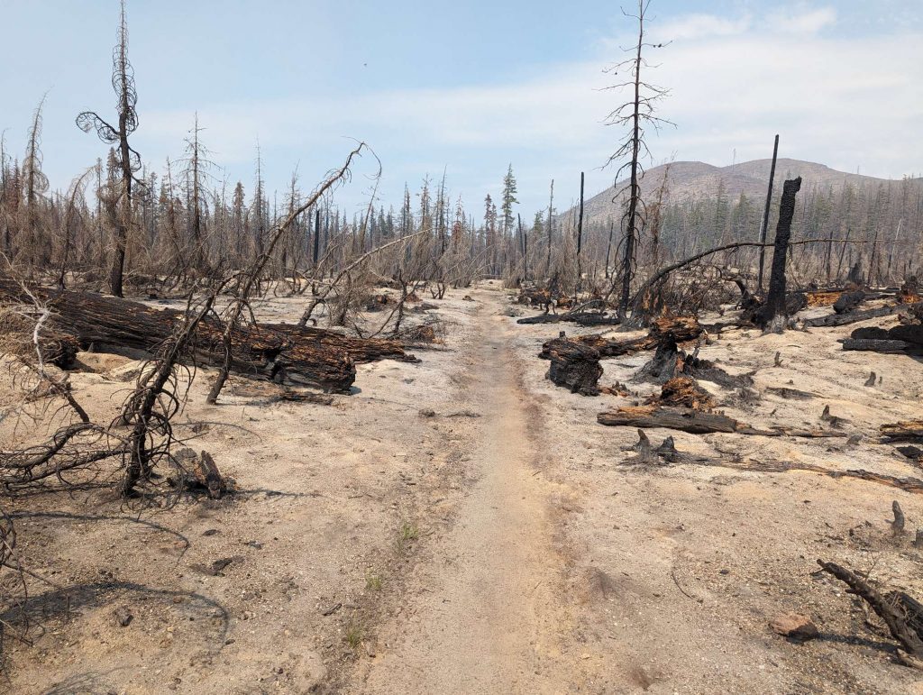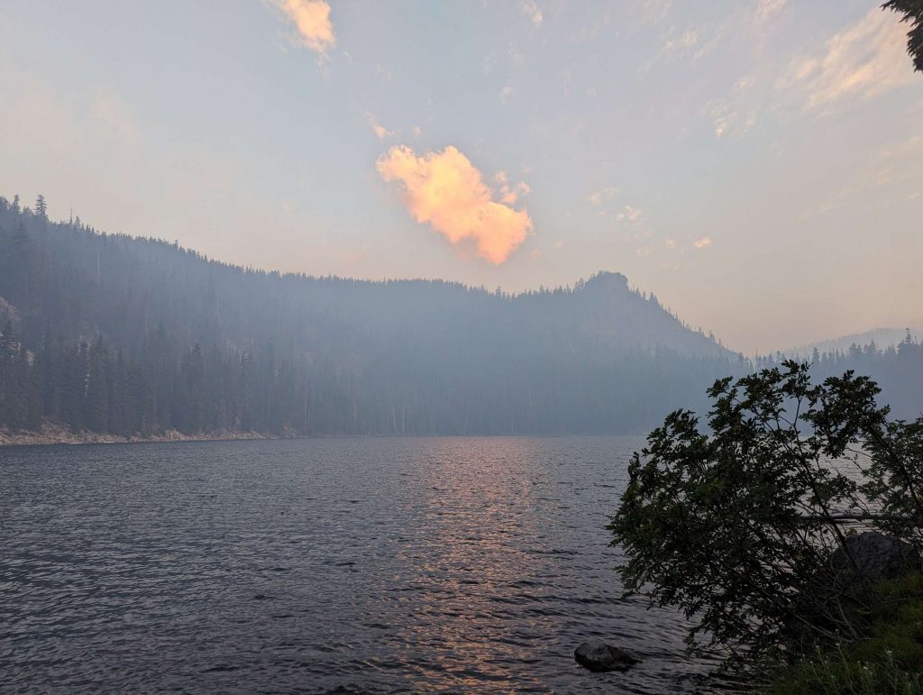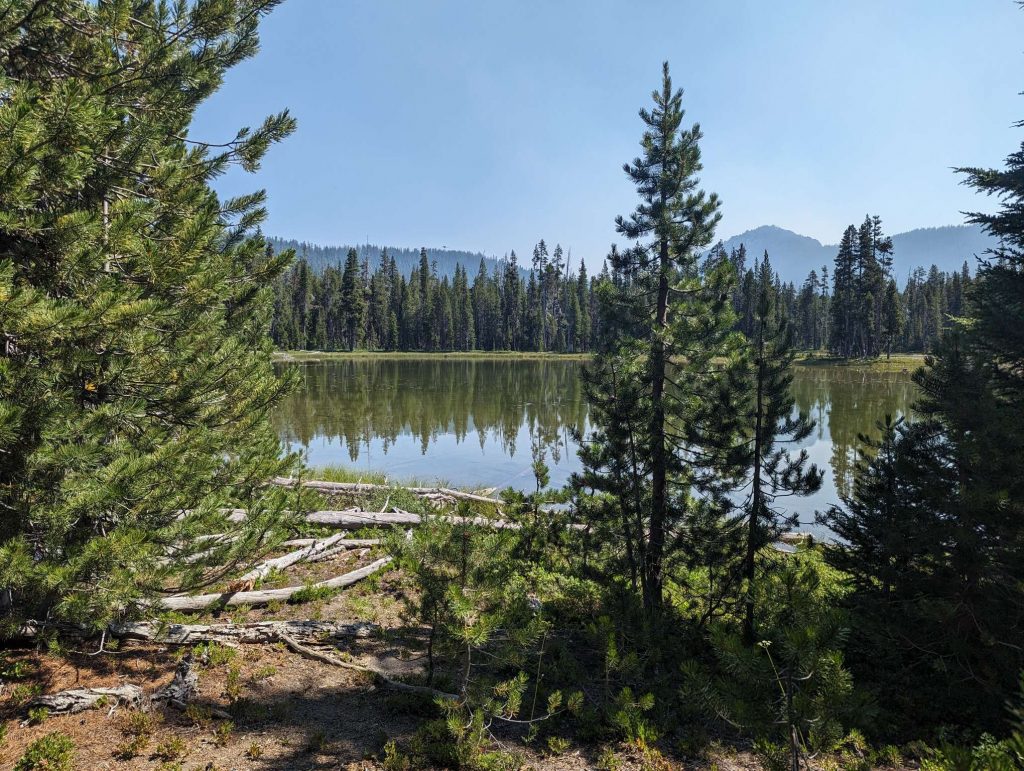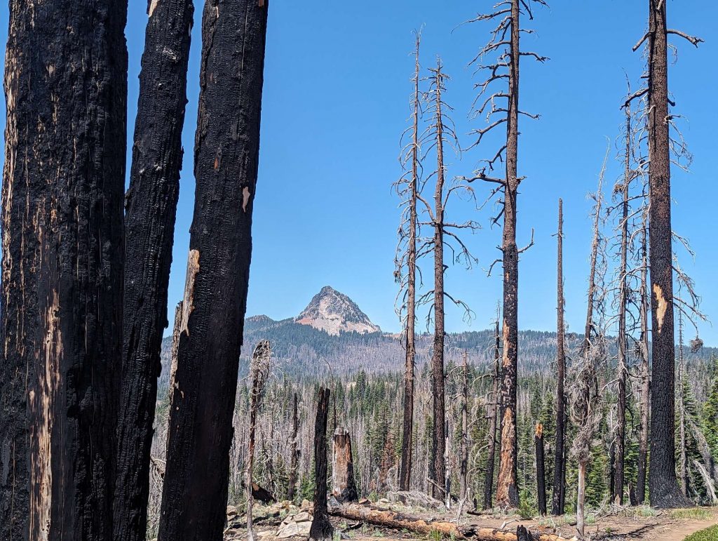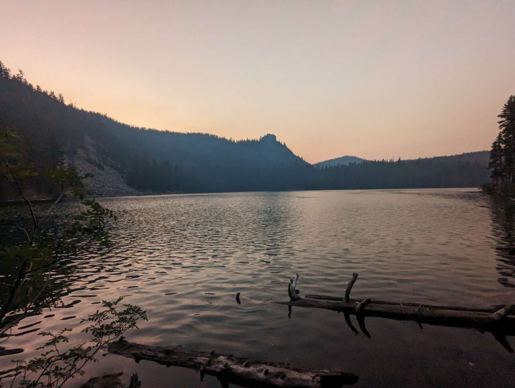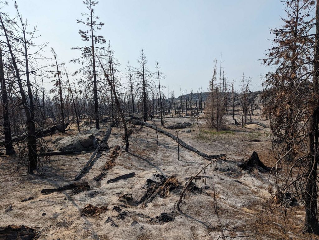 Am nächsten Morgen werden wir wach und sehen die Rauchschwaden. Schon in den letzten Tagen lag immer Rauchgeruch in der Luft, der mich irgendwie an zu Hause, den Ofen und Herbst erinnert. Wir sind etwas besorgt und haben zum Glück etwas Empfang, so dass wir recherchieren können. Es müsste der Rauch vom Bedrock-Feuer sein, dass westlich von uns liegt. Es scheint weit genug vom PCT weg zu sein und es gibt keine Sperrungen. Allerdings weht der Wind recht stark aus Westen und bevor wir aufbrechen lesen wir lieber nochmal nach, was zu tun ist, wenn wir auf Feuer treffen (umdrehen, Schutzsuchen auf Wiese, im Schlamm oder im See, immer Schutzplätze merken um ggf. darauf zurück zu greifen, notfalls flach hinlegen und ein Loch graben, in dem der Kopf liegen soll). Je höher wir steigen, desto besser wird es mit dem Rauch bis er ganz weg ist. Von oben sehen wir die Rauchschicht und sind froh, nicht den ganzen Tag darin zu wandern. Die Mittagspause verbringen wir an einem See, in dem ich schwimmen gehe (und versuche Dreck und Gestank loszuwerden). Direkt nach dem See und bis dahin gesundem Wald wandelt sich die Landschaft und wird zu einer apokalyptischen Gegend. Hier loderte scheinbar erst in den letzten Jahren ein Feuer. Es gibt keine grünen Pflanzen, nur Asche und verbrannte Baumstümpfe. Wir sind schon durch viele verbrannte Gegenden gelaufen, aber diese hier ist besonders. Es sieht aus, wie in einem Film in dem die Erde untergeht. Ich bin ganz schön erleichtert als es nach einigen Kilometern wieder in einen grünen Wald übergeht. Ich kämpfe etwas am Ende, weil meine Blasen durch die längeren Tagesstrecken wachsen und bin froh als ich unser Tagesziel an einem See erreiche. Wieder liegt Rauch in der Luft. Wir essen, planken und gehen erschöpft ins Bett. Eduardo ist nicht da. Er ist wahrscheinlich noch am selben See wie am Morgen, weil es dort Handyempfang gab (Später stellt sich raus, dass er wirklich bis 16uhr dort war. Aber wir sind zu langsam. Hmm.)