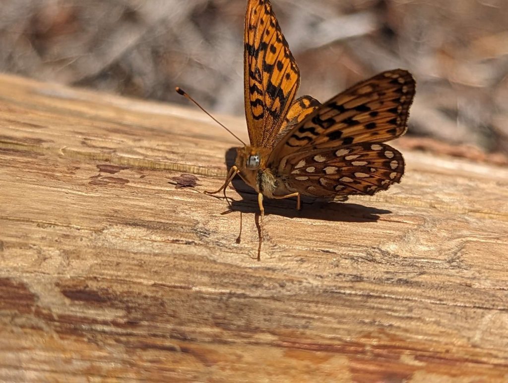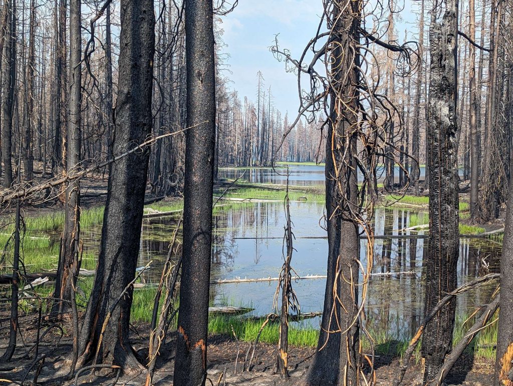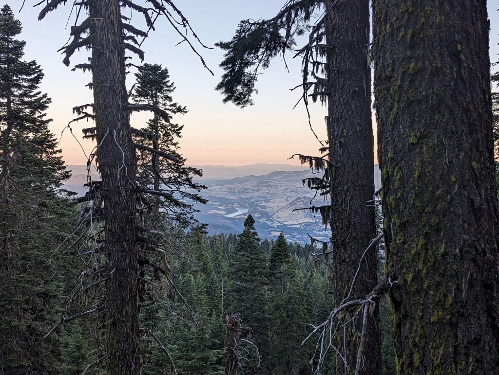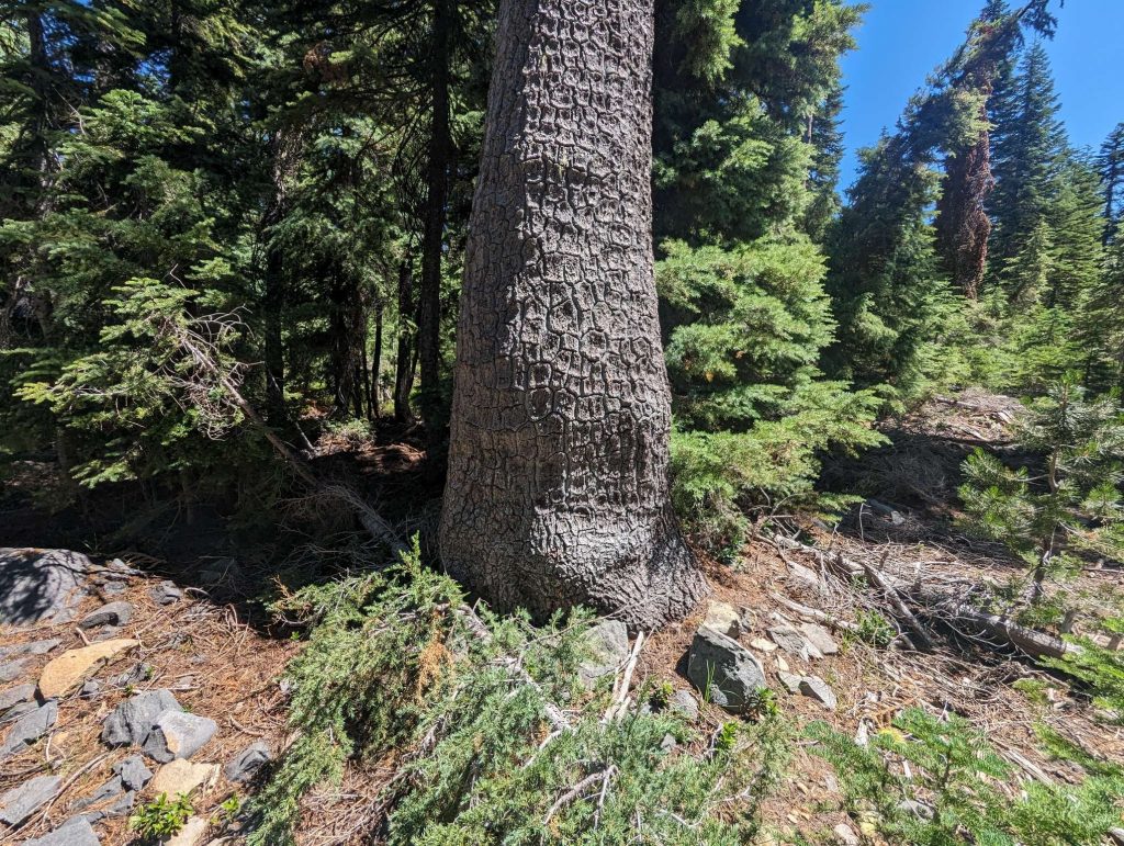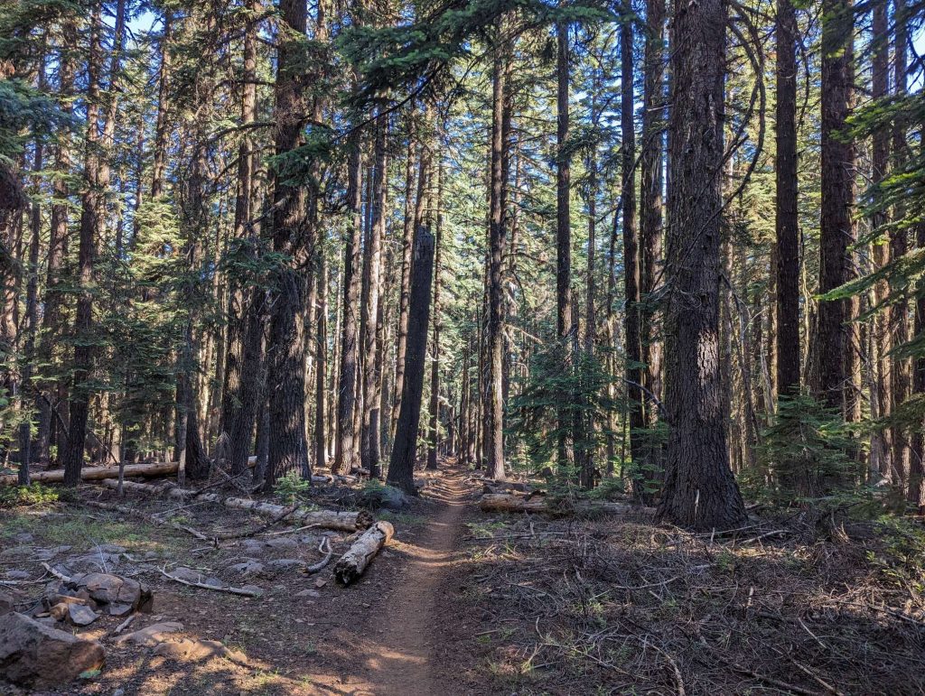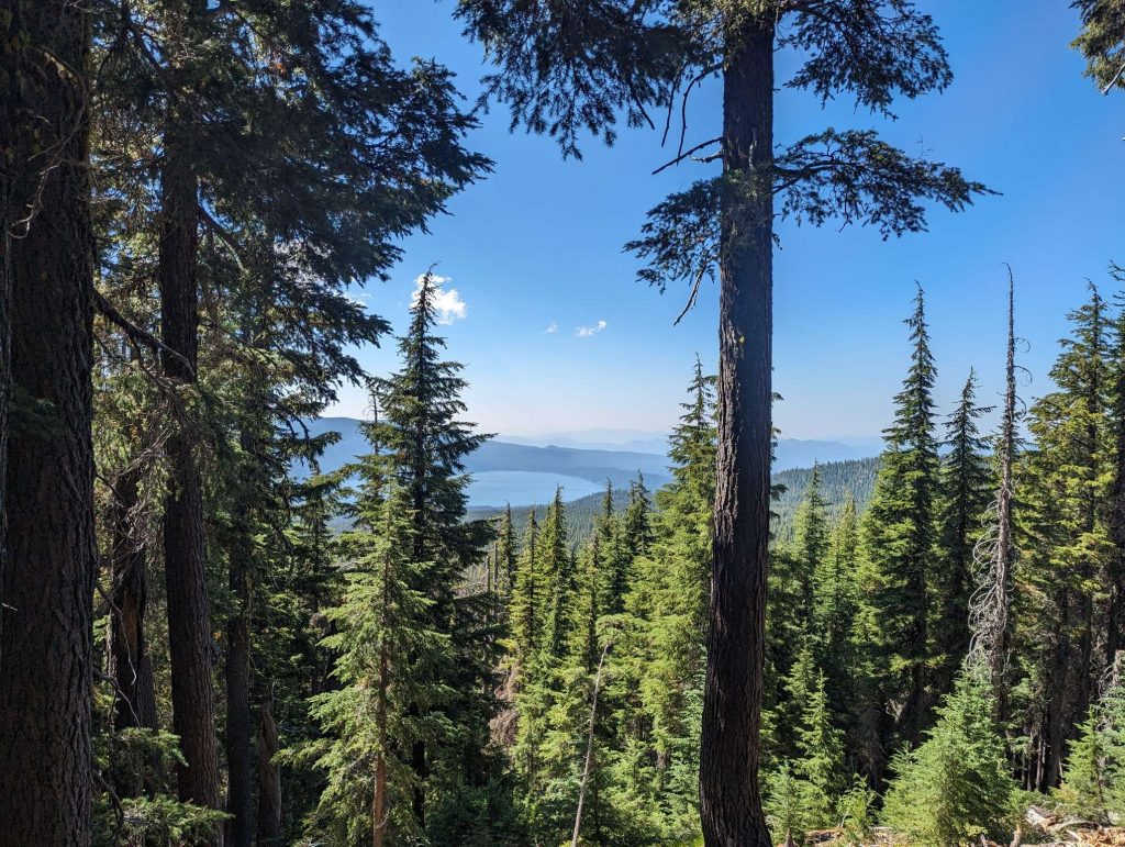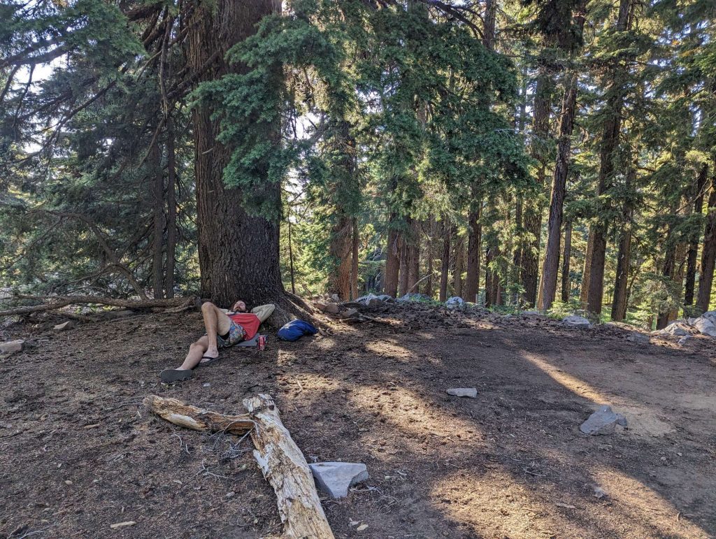 Am nächsten Morgen werden wir wach und sehen die Rauchschwaden. Schon in den letzten Tagen lag immer Rauchgeruch in der Luft, der mich irgendwie an zu Hause, den Ofen und Herbst erinnert. Wir sind etwas besorgt und haben zum Glück etwas Empfang, so dass wir recherchieren können. Es müsste der Rauch vom Bedrock-Feuer sein, dass westlich von uns liegt. Es scheint weit genug vom PCT weg zu sein und es gibt keine Sperrungen. Allerdings weht der Wind recht stark aus Westen und bevor wir aufbrechen lesen wir lieber nochmal nach, was zu tun ist, wenn wir auf Feuer treffen (umdrehen, Schutzsuchen auf Wiese, im Schlamm oder im See, immer Schutzplätze merken um ggf. darauf zurück zu greifen, notfalls flach hinlegen und ein Loch graben, in dem der Kopf liegen soll). Je höher wir steigen, desto besser wird es mit dem Rauch bis er ganz weg ist. Von oben sehen wir die Rauchschicht und sind froh, nicht den ganzen Tag darin zu wandern. Die Mittagspause verbringen wir an einem See, in dem ich schwimmen gehe (und versuche Dreck und Gestank loszuwerden). Direkt nach dem See und bis dahin gesundem Wald wandelt sich die Landschaft und wird zu einer apokalyptischen Gegend. Hier loderte scheinbar erst in den letzten Jahren ein Feuer. Es gibt keine grünen Pflanzen, nur Asche und verbrannte Baumstümpfe. Wir sind schon durch viele verbrannte Gegenden gelaufen, aber diese hier ist besonders. Es sieht aus, wie in einem Film in dem die Erde untergeht. Ich bin ganz schön erleichtert als es nach einigen Kilometern wieder in einen grünen Wald übergeht. Ich kämpfe etwas am Ende, weil meine Blasen durch die längeren Tagesstrecken wachsen und bin froh als ich unser Tagesziel an einem See erreiche. Wieder liegt Rauch in der Luft. Wir essen, planken und gehen erschöpft ins Bett. Eduardo ist nicht da. Er ist wahrscheinlich noch am selben See wie am Morgen, weil es dort Handyempfang gab (Später stellt sich raus, dass er wirklich bis 16uhr dort war. Aber wir sind zu langsam. Hmm.)