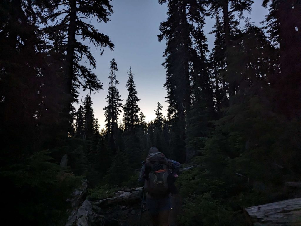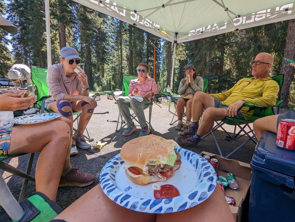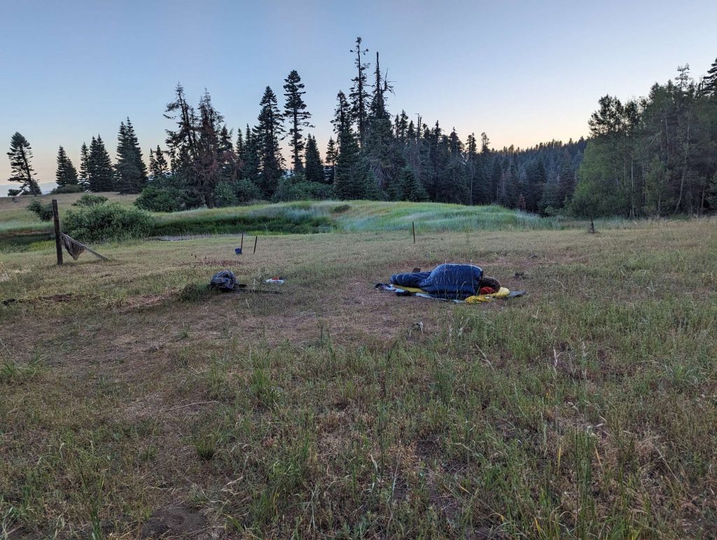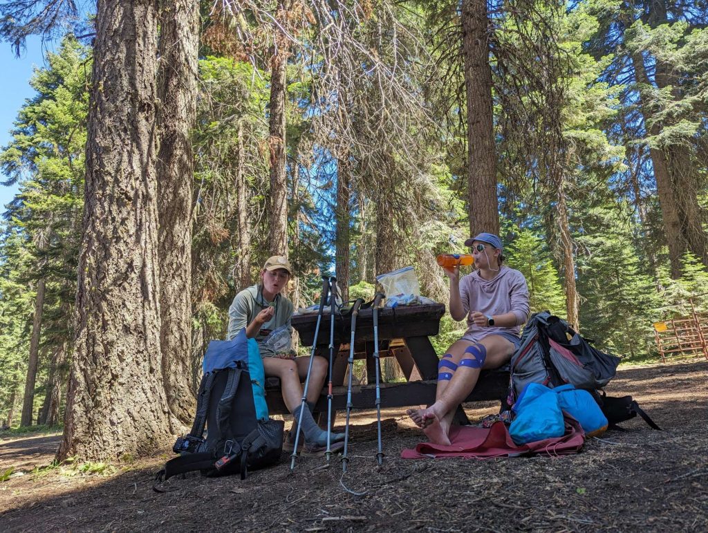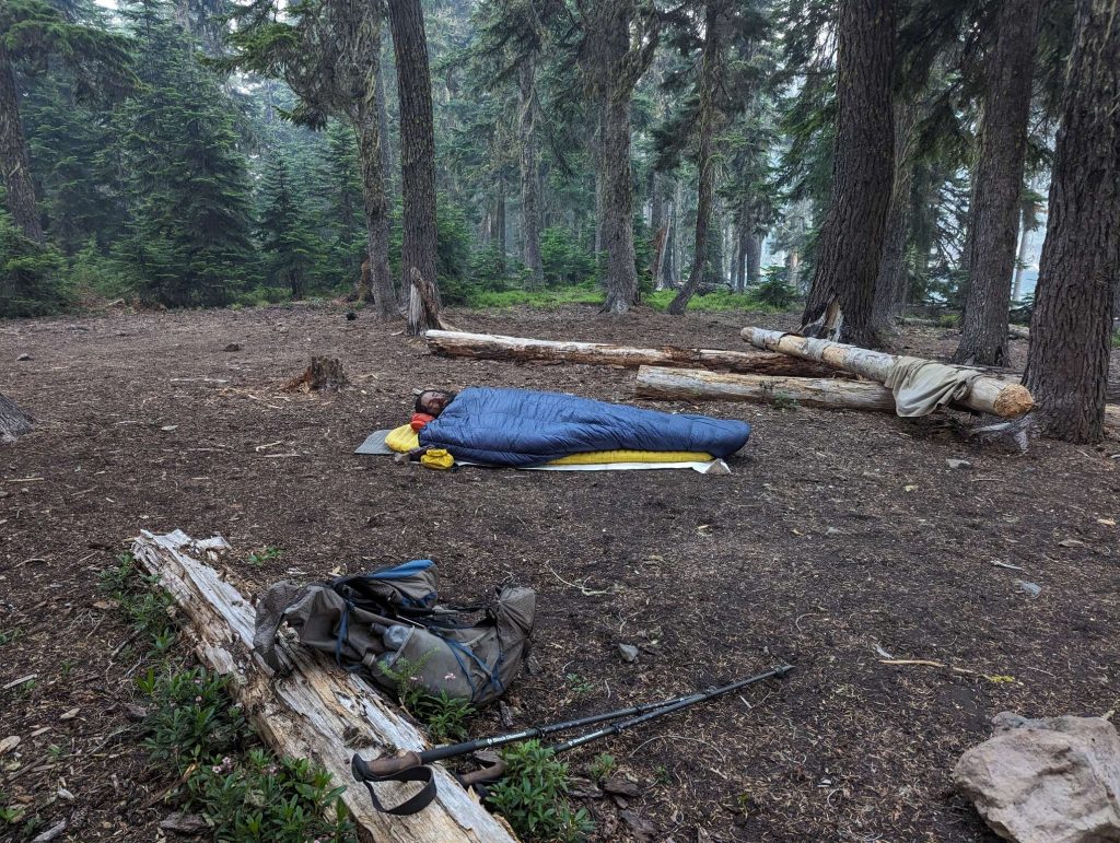Am nächsten Tag klingelt der Wecker um 4 Uhr. Ich habe wieder ohne Regencover geschlafen und nachts die Sterne beobachtet und einige Sternschnuppen gesehen. Das werde ich zu Hause auf jeden Fall vermissen! Heute haben wir 35km bis zum Campground in Crater Lake National Park vor uns, wo wir ein Paket haben, duschen, Wäsche waschen und laden wollen. Es geht fast nur bergab, aber der Tag ist schwer für mich. Meine Hüfte drückte in den letzten Tagen etwas, aber heute tut sie wirklich weh. Jede halbe Stunde muss ich Pause machen. Ich quäle mich durch den Tag und komme endlich am Parkplatz an. Von dort müsste man noch weiter auf der Straße laufen, aber Clumsy hat sich schon um eine Mitfahrgelegenheit gekümmert. Das freut mich sehr. Auf dem Campingplatz sind sehr viele Wanderer. Ich weiß nicht genau, warum, aber je weiter wir nördlich sind desto unfreundlicher die PCTler. Es gibt einige etablierte Gruppen. Die wollen vielleicht eher für sich bleiben. Manche sind vielleicht auch in einem Tief. Die Atmosphäre unter den Wanderern hat sich jedenfalls ganz schön verändert. Und mir fällt es heute besonders auf, weil ich ziemlich erschöpft bin und mir die vielen Menschen zu viel sind. Zumindest treffen wir Salty und Corpsi wieder und essen nach unseren Aufgaben gemeinsam im Restaurant. Erst 22 Uhr geht es in die Zelte. Aber morgen können wir ja ausschlafen.
