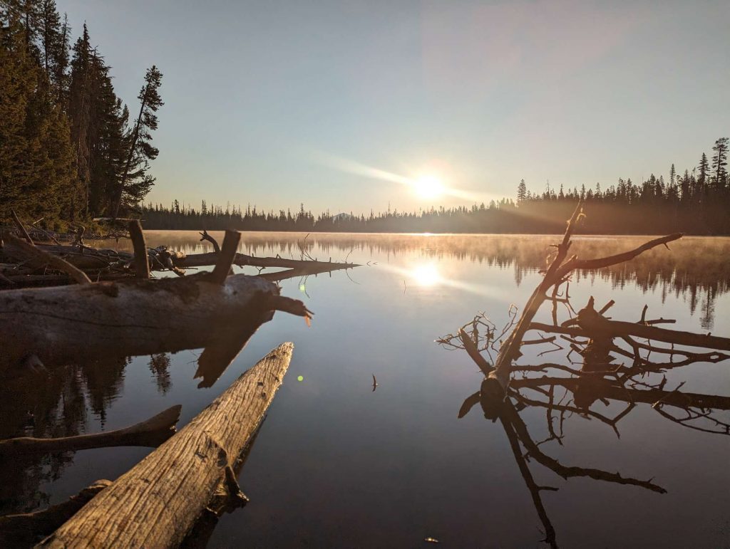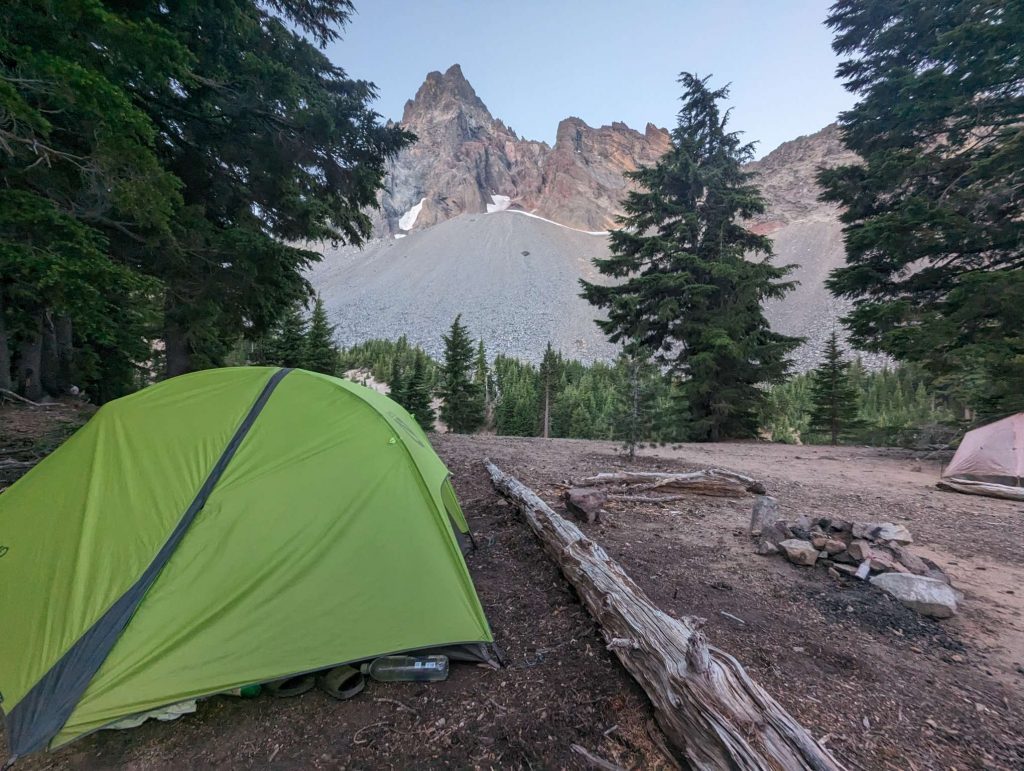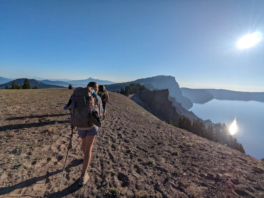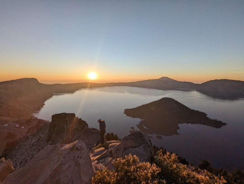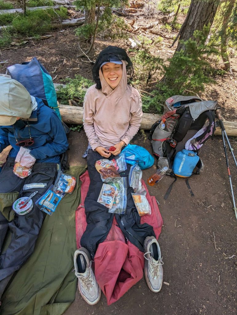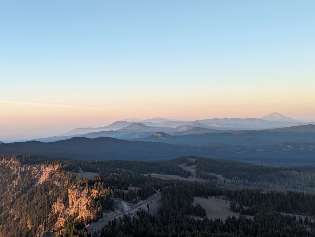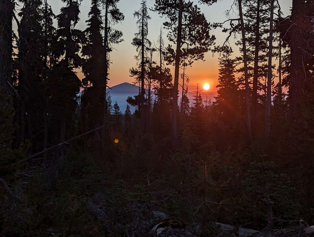 3 Uhr klingelt der Wecker. Wir packen im Licht unserer Stirnlampen zusammen und machen uns auf den Weg auf den Watchman. Von hier wollen wir den Sonnenaufgang über dem See sehen. Die 10km laufen wir flink im Mondlicht und erreichen als erste Gruppe den Aussichtspunkt. Wir setzen uns in die erste Reihe auf die Absperrung und packen uns gut ein. Es ist ziemlich kalt. Eine Stunde später kuckt die Sonne über den Horizont. Mittlerweile sind noch 2 andere Gruppen dazugekommen, alles PCTler. Unter anderem auch Riverdance, der auch ein unangenehmer Zeitgenosse ist. Wir 3 Mädels sind ihm zu laut und wagen es, manchmal vor ihm anzukommen… Grumpy hätte wohl besser als Trailname gepasst. Wenn er uns morgens überholt, grüßt er nicht mal. Sobald die Sonne da ist, hetzen alle los. Auch wir haben 40km vor uns, aber gehen etwas gemütlicher los. Am Vormittag habe ich richtig viel Energie und überhole alle. Diesmal schauen sie nur meiner Staubwolke nach. Nach der Mittagspause kämpfe ich allerdings. Ich glaube, ich habe zu viel Schokolade gegessen. Als ich bemerke, dass ich mein Bandana (ein Geschenk von Astrid) vergessen habe, schreibe ich eine Nachricht an Eduardo. Er hat natürlich wieder ausgeschlafen und ist hinter uns. Vielleicht hat er ja zufällig Lust, zum Aussichtspunkt zu gehen und nach meinem Bandana zu schauen. Unsere Zeltstelle ist sehr idyllisch mit Blick auf Mount Thielsen. Es sind alle anderen Hiker hier aus unserer Bubble (Ansammlung von Wanderern mit ähnlichem Tempo). Zusammen essen wir und nach den Planks gehts in die Schlafsäcke. Es war ein langer Tag.