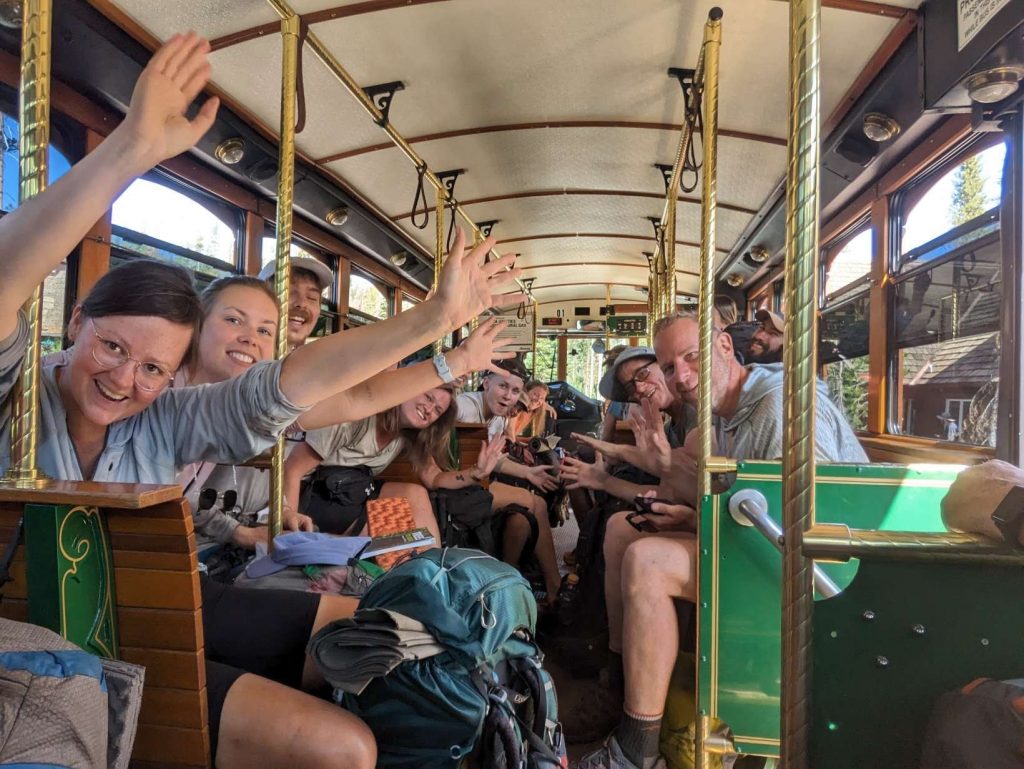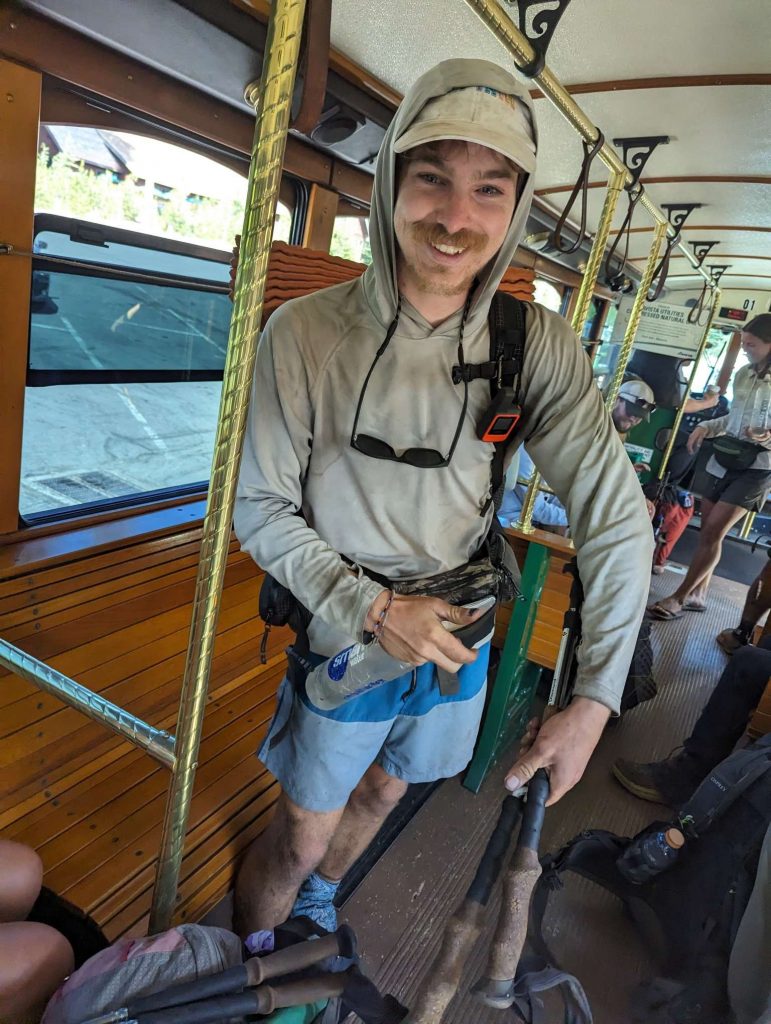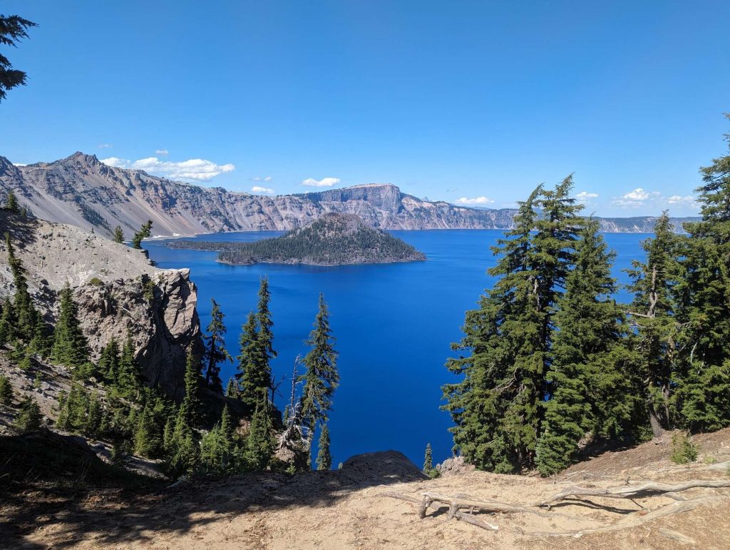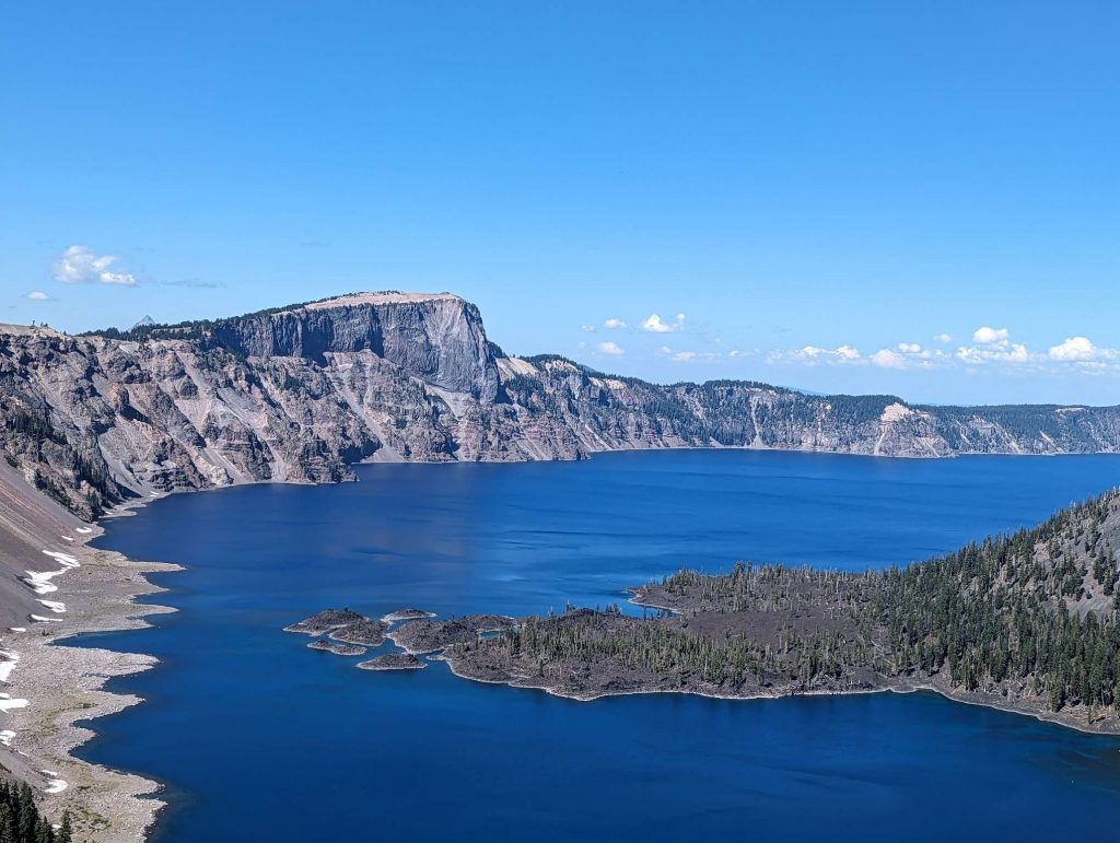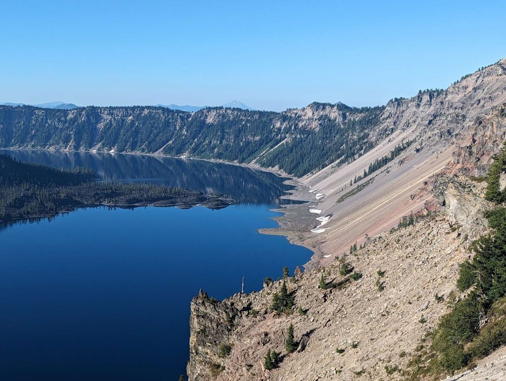 Um 5:30 liege ich mit offenen Augen im Zelt. Ich stehe auf und setze mich zum Laden meines Handys in den Waschraum bis das Restaurant um 7 Uhr aufmacht. Eduardo kann auch nicht schlafen und wartet ab 6:30 mit mir aufs Restaurant. Dort ‚betrinken‘ wir uns ab 7:00 den Kaffee. In den USA gibt es ja die Refills – Kaffee ohne Ende. Um 11 Uhr nehmen wir den Trolley zur Ranger Station. Er ist voll mit Hikern. Kurz vor Abfahrt hetzt ein stinkiger Hiker in den Bus und setzt sich zwischen uns anderen Geduschten und Duftenden. Es war Rango! Er hat uns eingeholt – wie schön. Und er hat ein neues Basecap. Es steht Captain drauf. Ich beneide ihn dafür und schmiede Pläne, wie ich es ihm abluchsen kann. An der Ranger Station angekommen, bemühen wir uns um eine Erlaubnis für einen Zeltplatz im Nationalpark und haben Glück: noch einer frei. Danach hitchen wir zum Rim Village – das Besucherzentrum des National Parks auf der Ladefläche eines Pickups. Der Wind bläst uns um die Nase. Wir genießen die Fahrt im schönen Wald. Vor 4 Jahren war ich schon mal hier mit Cyril. Das ruft schöne Erinnerungen hervor. Wir verbringen den Tag mit Internet und viel Cola und treffen Overturf, den wir das letzte Mal in der Wüste gesehen haben. Gegen 5 Uhr machen wir uns auf den Weg zum Zeltplatz und schießen unterwegs viele Fotos vom imposanten See, der durch einen Vulkanausbruch entstanden ist. Durch die leeren Magmakammern ist der stattliche Berg einfach zusammengefallen. Den Abend verbringen wir am Zeltplatz und essen zusammen mit Salty und Co. Ganz nette Leute. Sie würden ganz gut in unsere Truppe passen, aber sind viel zu schnell für uns.