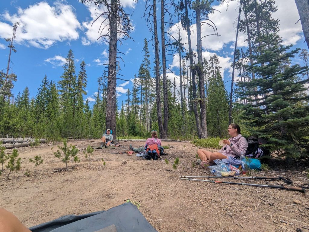 Am nächsten Tag schlafen wir aus. 5:30 Uhr klingelt der Wecker, aber ich war schon wach. Ich wandere wieder alleine und genieße das monotone Geräusch meiner Schritte. Ich denke über eine kleine Ausstellung nach und habe ziemlich viele Ideen dafür. An einer Wasserquelle (der letzten für 20km) sammeln sich viele Wanderer. Ein besonders neugieriges Chipmunk versucht aus den Rucksäcken Essen zu stehlen. Es ist erfolgreich und ergattert etwas Popcorn. Wir waren zu langsam um es zu verscheuchen. Ein Wanderer kommt vorbei und läuft einfach weiter. Wir schauen uns verdutzt an und rufen hinterher, ob er kein Wasser braucht. Er kommt zurück und sagt, sein Handy (inkl. der App mit allen Wasserquellen) ist aus und er weiß nicht, wo Wasser ist. Die nächste Wasserquelle ist 30 km entfernt. Das wäre hart geworden so ohne Wasser. Nach dem schönen Waldbodentrail geht es auf in einer burnt area bergauf. Ich studiere die Topokarte und sehe, dass es für 1 Stunde so weitergeht. Alle paar Meter muss man über umgestürzte Bäume klettern. Darauf war ich nicht vorbereitet und stapfe vor mich hinschimpfend den Grat entlang. Hinter mir taucht in einem Affenzahn ein Wanderer auf. Ich lasse ihn passieren und wir quatschen einige Minuten stehend. Es stellt sich heraus, dass das Salty ist. Diesen Namen habe ich in den vergangenen Wochen sehr oft in den Trailregistern gelesen. Es ist schön nun endlich die Person dazu zu kennen. Wir wandern eine Stunde zusammen, d.h. ich hetze hinter ihm her und schnappe nach Luft. Er ist gestern 36 Meilen gewandert und will das heute wiederholen – einfach nur crazy! Ich bin physisch gar nicht dazu in der Lage. Nach einer Weile muss er los und ich schaue nur seiner Staubwolke nach. Vertieft im Gespräch und Hetzen habe ich die tolle Landschaft um mich herum gar nicht richtig wahrgenommen. Das hole ich in meinem Tempo mit Celine Dion in den Ohren nach und schlendere bergab. Eduardo hat uns zwischenzeitlich überholt und ich finde ihn an einer Wasserquelle vor. Wir haben noch einige Kilometer vor uns und ich fülle nur kurz Wasser auf und mache mich mit neuer Musik bereit für den Endspurt. Doch nach 100m sehe ich die Mädels neben ihren Rucksäcken sitzen. Sie haben eine Zeltstelle mit genialer Aussicht auf die umliegenden Wälder gefunden und schlagen vor, hier zu bleiben. Gute Idee! Die fehlenden Kilometer können wir morgen schnell aufholen. Wir rufen Eduardo dazu und essen endlich mal zusammen.