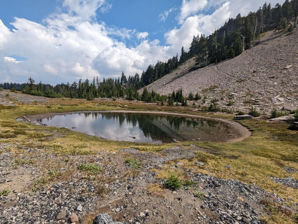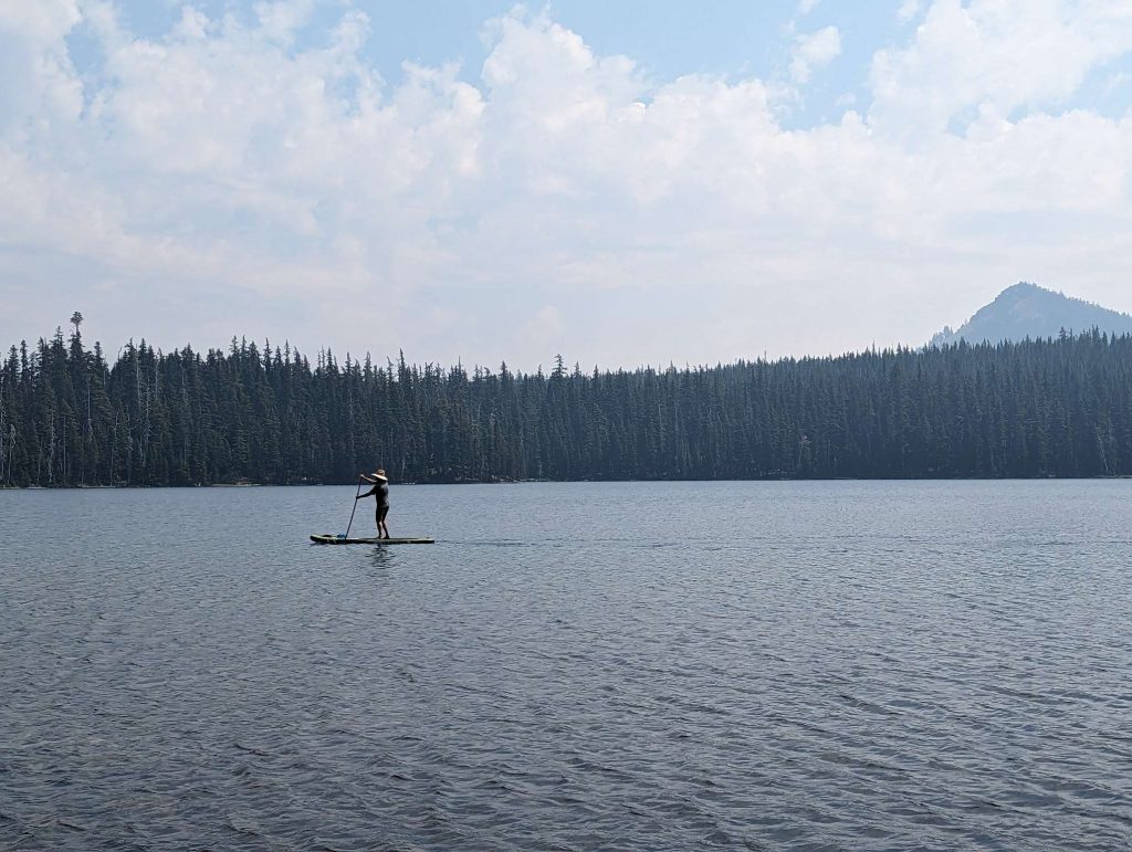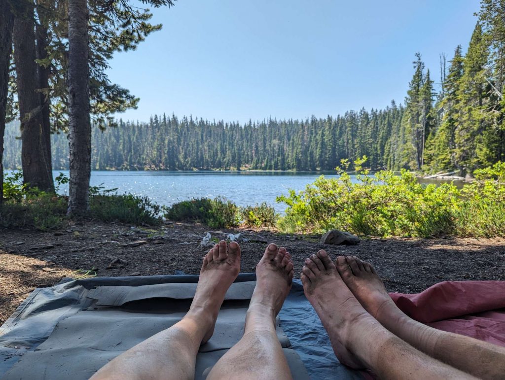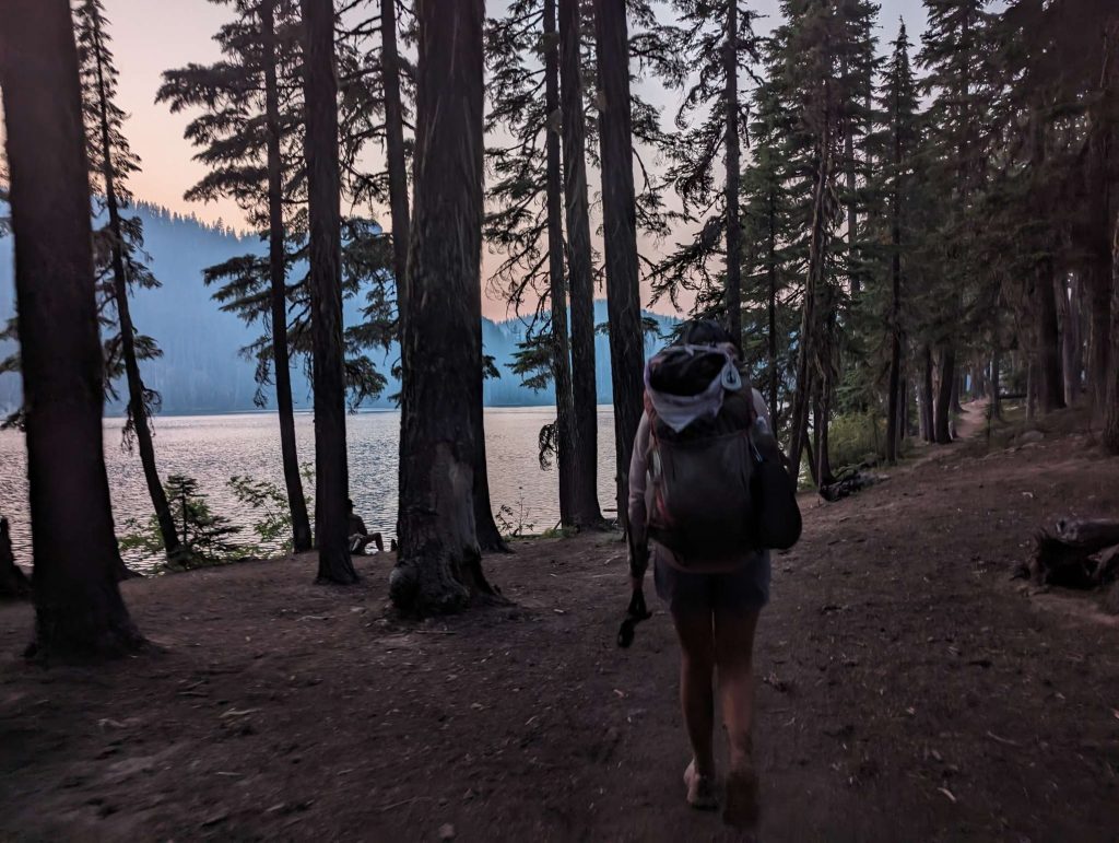 5:00 Uhr klingelt der Wecker. Es sind 30km bis Shelter Cove, wo uns ein Imbiss erwartet. Da es flach ist, kommen wir gut voran. Pause machen wir an einem Naturcampingplatz mit Tischen. Ich freue mich immer sehr an einem richtigen Tisch essen zu können und gönne mir einen Instantkaffee. Gegen 14 Uhr erreichen wir Shelter Cove und genießen Burger, Kaltgetränke und den hübschen Odell-See. Es sind sehr viele andere Wanderer da. Davon leider viele, die ich eher so lala finde (laute, immerzu redende und sich dabei wiederholende, schlecht gelaunte). Aber wir treffen auch Salty und seine Gruppe. Außerdem einen netten Berliner (aber in Leipzig geboren und aufgewachsen). Wir laden unsere Elektrogeräte, essen, spielen Karten und plaudern. Der schlecht gelaunte Riverdance ist auch hier und will gerade ansetzen über uns zu reden (warum wir schon wieder vor ihm hier sind, wie das sein kann, etc) als Clumsy sich umdreht und ihn fragt, ob er etwa über uns lästern will. Er wusste nicht, dass wir hinter ihm sitzen. Sein Gesicht war lustig. Direktheit können die Amis nicht abhaben und er stottert irgendwelche komischen Worte und wird rot. Ich versuche nur innerlich zu lachen, was mir halb gelingt. 18:30 Uhr wollen wir noch 10km weiter. Wir Mädels stehen fertig gepackt da. Nur Eduardo ist mal wieder spät dran. Nach 20 Minuten ist er endlich soweit. Nervig! Jetzt müssen wir das letzte Stück im Dunkeln gehen. Wir rennen förmlich den Berg hoch und die 10km sind schnell geschafft (5km/h). Unsere Zeltstelle liegt an einem wunderschönen kleinen See an dem ich noch eine kleine Weile im Dunkeln sitze und den Miniwellen zuhöre bevor ich ins Bett gehe. Es ist ganz schön, schon eher zu essen und im Camp nur noch das Zelt aufbauen zu müssen.