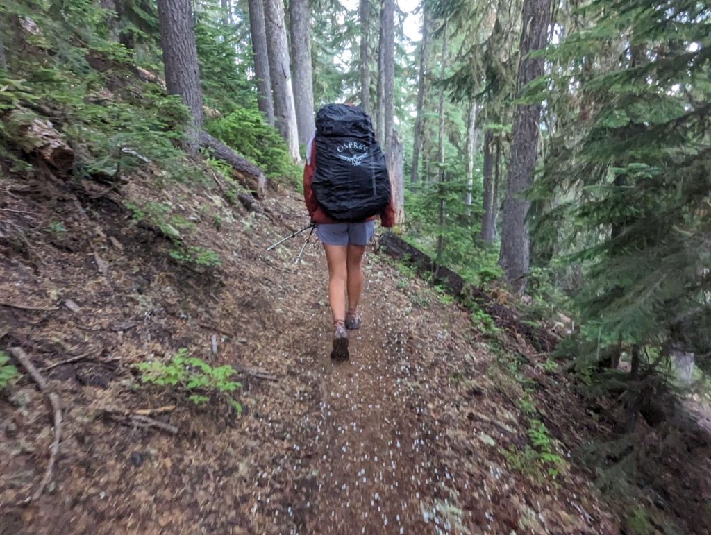 Heute ist etwas der Wurm drin. Wir sind alle demotiviert, obwohl ein Meilenstein ansteht: Wir werden heute den Midpoint überschreiten. Vielleicht sind wir auch genau deswegen demotiviert – erst die Hälfte geschafft? 2,5 Monate im Zelt, fast jeden Tag wandernd liegen hinter uns. Es fühlt sich schnell und langsam zugleich an. Wir machen, was wir immer machen: laufen los unf setzen einen Schritt vor den anderen. Der Wald ist schön und der Boden lässt sich prima laufen. Irgendwann ist Eduardo da. Wir streiten uns über den Meilenmarker für den Midpoint. Ich und Apollo haben ein fast übereinstimmendes Ergebnis, aber Eduardo ist anderer Meinung und zieht auch nicht in Betracht, dass er falsch liegen könnte. Schon allein das macht mich wütend. Ich schlucke meinen Ärger runter. Die Klügere gibt nach. Immerhin bringt er von einem Resort Cola, Bier und Muffin zu seinem Midpoint. Das ist nett. Trotzdem nehme ich das nur widerwillig. Er bleibt, wie sollte es anders sein, im Resort und wir Mädels gehen weiter. Schon den ganzen Vormittag gab es dunkle Wolken. Der Wetterbericht hat auch Gewitter und Regen angekündigt. Wir laufen trotzdem los und kurz nach Abmarsch beginnt es zu regnen und zu donnern. Ich bin eine Schisserin bei Gewitter und zucke jedes Mal beim Donner zusammen. Nach kurzer Zeit sind wir nass. Ich gehe die Sachen in meinem Rucksack durch und denke/ hoffe, dass alles trocken in Drybags verstaut ist. Meine teure Regenjacke saugt sich sofort mit Regen voll anstelle ihn abzuperlen. Atmungsaktivität adé! Die 18km vergehen recht schnell. Als wir durchnässt an den Zeltstellen ankommen, sind viele Pläze mit Wochenendwanderern belegt. Wir finden zum Glück noch ein kleines Plätzchen und bauen unser Zelt auf. Mein Rucksack ist durchtränkt inklusive meiner Daunenjacke, die nicht in einem wasserdichten Sack war. So eine Idiotin! Ich ärgere mich über mich selbst und hoffe, die Jacke kann trocknen und hat keinen Schaden genommen. Wir essen unser extra für den Midpoint gekauftes Backpackermeal zu 10$ pro Tüte klitschnass im leichten Regen. Ein trauriger Haufen. Aber wir freuen uns trotzdem, denn wir sind einen neuen Streckenrekord gelaufen: knapp 45km und das im Regen. Morgen können wir unsere Sachen hoffentlich trocknen.