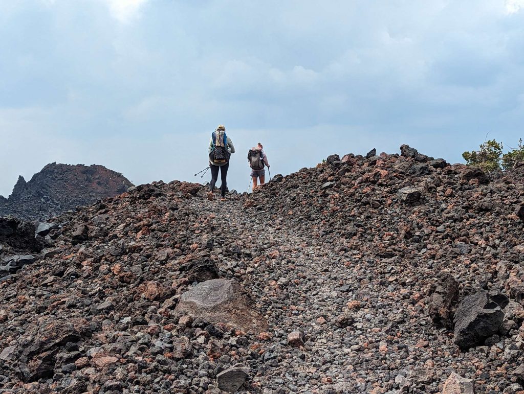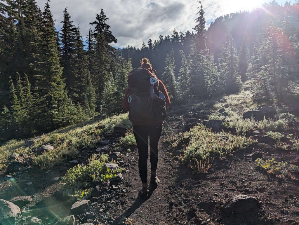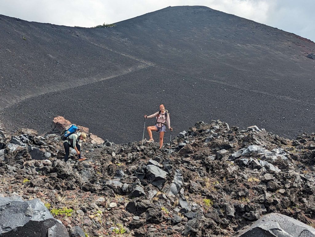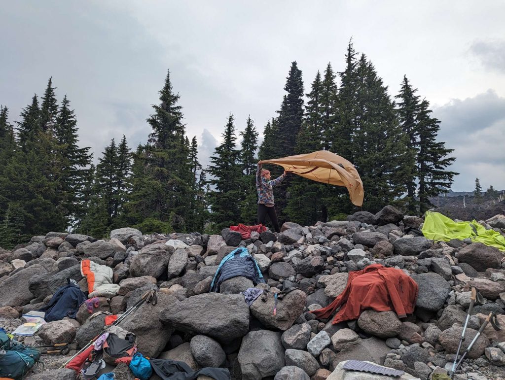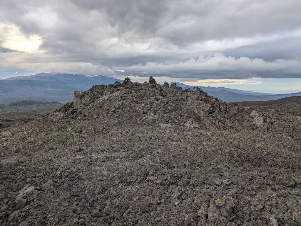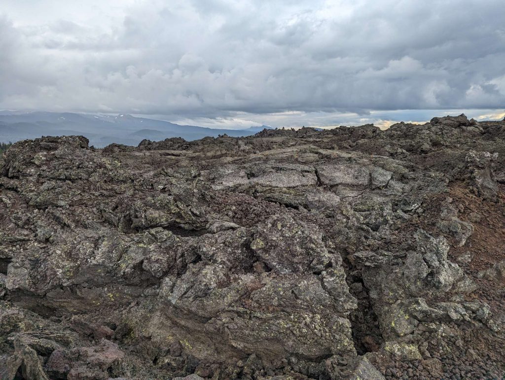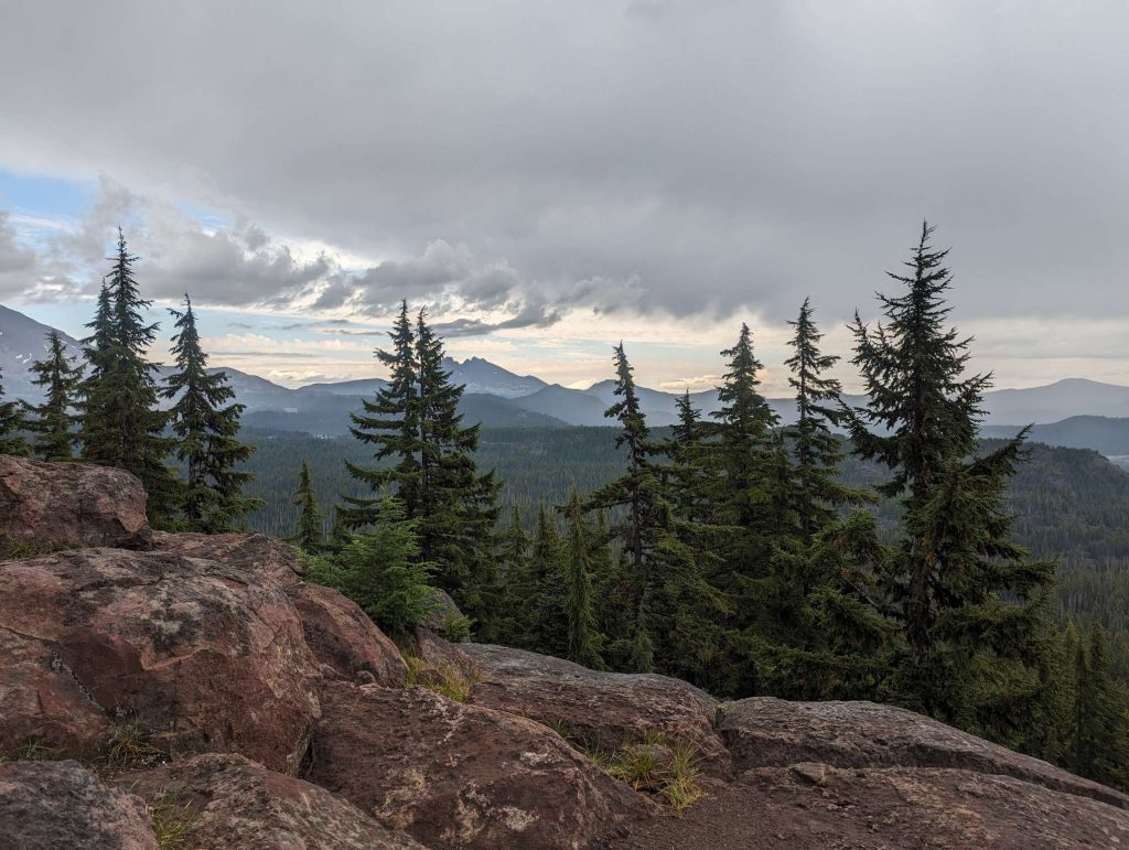 Am nächsten Morgen fällt das Aufstehen schwer. Alles ist nass und kalt. Zur Regennässe kommt Kondensation, weil wir in einer Senke unser Lager aufgebaut haben. Wir stopfen alles nass in die nassen Rucksäcke und marschieren los, damit uns warm wird. Ich trage meine lange Merinohose und mein Fleece, weil meine Wanderkleidung noch zu nass ist. Socken und Schuhe kommen nass an die Füße, dafür gibt es keine Alternative. Der Himmel ist wolkenbedeckt. Sobald sich ein bisschen Sonne durchkämpft stoppen wir und legen die Sachen zum Trocknen aus. Wir sitzen am Wegesrand und hören von Weitem Geschwatze. Ich denke noch, wer redet denn am frühen trüben Morgen so viel beim Wandern als Rave und Clark auftauchen, ein nettes junges Ehepaar aus Amerika. Wir kennen sie von Scout und Frodo und haben sie in den ersten Tagen immer mal gesehen. Bis sie nach einer Woche verkünden:“Ab jetzt laufen wir 30km“. Und weg waren sie. Wir sehen sie nur wieder, weil sie 2 Wochen Pause gemacht haben um zu Hochzeiten zu gehen. Wir tauschen unsere Geschichten aus. Sie sind recht lange mit Constant gewandert, mit dem Manon und ich vor 2,5 Monaten in der Wüste gestartet sind. Wir hàtten uns eigentlich sehen müssen als wir südwärts gelaufen sind. Leider hatten sie an diesem Tag ihre 24 Stunden Challenge und sind an unserem Lager gegen 21 Uhr vorbeigekommen als wir làngst geschlafen haben. Wir waren die ganze Zeit über unsere App verbunden und konnten sehen, wo der andere gerade steckt. Den ganzen Tag über war ich aufgeregt und dachte, dass jeder entgegenkommende Wanderer Constant ist. Leider kam er nicht tagsüber, sondern in der Nacht (20 Uhr ist Hikermidnight). Als sie an unserem Lager vorbeikamen, meinte Constant noch, in einem dieser Zelte schläft Bianka. Zumindest hat er an mich gedacht. Wir quatschen viel zu lange und verabschieden uns schließlich. Ich bin zu langsam und verliere die beiden Mädels schnell. Nach einigen Kilometern kommt wieder die Sonne raus und ich lege Daunenjacke zum Trocknen aus während ich Wasser filtere. Außerdem schlüpfe ich in die noch immer nassen Wanderklamotten. Sie trocknen am Körper besser, hoffe ich. Weiter gehts durch schönen Wald mit schon wieder dunklen Wolken. Wir sind in der 3 Sisters Wilderness benannt nach 3 Bergen. Es sind sehr viele Tagesausflügler unterwegs. Scheint eine beliebte Gegend zu sein für die Städter. Ich habe aufgegeben, die Mädels heute noch vor dem Camp zu sehen, aber treffe sie auf einem Steinfeld mit ausgebreiteten Rucksackinhalt zum Trocknen. Ich lege meinen Kram dazu. Meine Klamotten sind inzwischen trocken und die Daunenjacke halbtrocken. Nach der Pause geht es weiter durch Lavalandschaften mit Blick auf Berge und sich auftürmenden Wolken. Wir rennen etwas gegen die Zeit und bleiben nicht zu oft stehen. Es sind Regen und Gewitter angekündigt. Diesmal sind wir aber besser vorbereitet: Ich habe alles in Packsäcken verstaut und diese in einem Liner (große Tüte im Rucksack). Regenjacke und -hosen sind ganz oben. Soll der Regen doch kommen! Wir wandern zusammen und machen gegen 17:30 Pause zum Abendessen. Vor uns liegen noch 10 Kilometer, davon 7km auf einem Lavafeld bergauf. Die Lavafelder sehen echt genial aus, aber sind extrem schwer zu laufen. Ständig knickt man um oder bleibt mit den Wanderstöcken stecken. Trotzdem gehen wir das an, denn morgen kommen wir nach Sisters, wo wir in einem Hotel schlafen wollen. Es beginnt zu regnen und wir laufen los. Schritt für Schritt geht es bergauf. Ich bin etwas hinter den Mädels und höre ein Hörbuch. Langsam wird es dunkel und das Hörbuch ist etwas gruselig. Als es dann neben mir knackt, gehe ich schneller. Mit Adrenalin im Blut geht es plötzlich doch schneller. Ich erreiche die Mädels und setze meine Stirnlampe auf. Und dann haben wir es geschafft! Direkt hinter dem Lavafeld ist eine passende Zeltstelle. Im Dunkeln bauen wir die Zelte auf und kriechen hinein. Trotz Regen, nassen Klamotten, langem Schwatz, Klamotten trocknen, Lavafeld sind wir 42km gelaufen und können stolz auf uns sein!