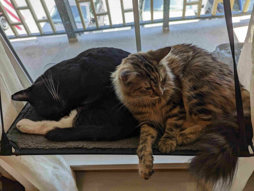 Eigentlich schreit mein Koerper nach einer Dusche, aber alle finden sich in der Bakery ein (die armen anderen Gaeste). Wir sind staubig und schmutzig und stinken ganz fuerchterlich. Ich traue mich gar nicht, meine Muetze abzunehmen. Manon leiht mir ihr Bandana. Damit gehts. Jemand hat unterwegs einen Wasserfilter und seine Wasserblase verloren, ein anderer hat es gefunden und mitgebracht. Die Wiedersehensfreude ist gross (das Gefuehl kenne ich mit meinen geliebten Schuhen). Manon und ich teilen uns ein ueberdimensioniertes Gericht aus Kartoffelwuerfeln mit Kaesesosse und Spiegelei und jeder einen Milchshake. Sehr lecker, aber echt massiv. Danach wollen wir eine Unterkunft finden. Wir sind eine grosse Gruppe. Es sieht aus wie bei einem Schulausflug. Im Julian Inn nehmen wir 2 Zimmer fuer 9 Leute. In der Rezeption sammeln sich 9 Stinkies und deren Stinkie-Rucksaecke. Im Aufenthaltsraum wohnen 3 Katzen, die richtig suess sind! Sie haben viele verschiedene Relaxmoeglichkeiten, ua. ein Gestell am Fenster.