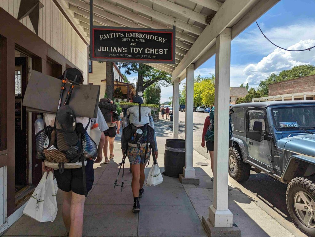 Die erste Woche ist vorbei. Wir haben schon 125km zurueckgelegt und sind in der ersten Stadt namens Julian um uns mit neuer Verpflegung und ich insbesondere neuen Medizinprodukten einzudecken. Die erste Woche hat an meinen Beinen und Füßen einigen Schaden hinterlassen. Meine Füße sind mit abgetapten Blasenpflastern ueberdeckt, Insektenstiche sind wegen allergischer Reaktion zu grossen roten Flecken angewachsen, an Bueschen reisse ich mir immer wieder Wunden in die Haut und zu allem Ueberfluss giesse ich mein heisses Abendessen ueber meinen Koerper, so dass auch noch ein paar Verbrennungen dazukommen. Aber es macht trotzdem noch Spass. Gehoert vielleicht auch ein bisschen dazu. Mein Medizinkit umfasst jetzt jedenfalls ein grosses Angebot an Blasenpflastern, Leukotape, antibakteriellen Tuechern, Cremes gegen Verbrennungen und ganz vielen Pflastern in verschiedenen Groessen. Meine Blasen merke ich jetzt nur noch am Abend. Sie sind eingepackt unter Blasenpflaster, Leukotape und zwei paar Socken.