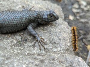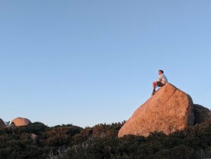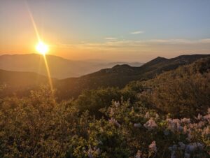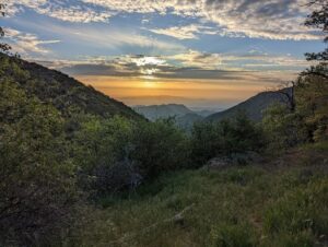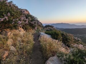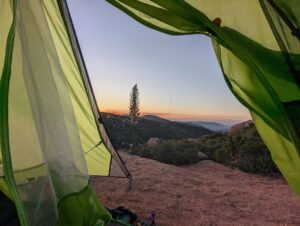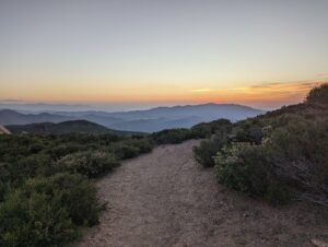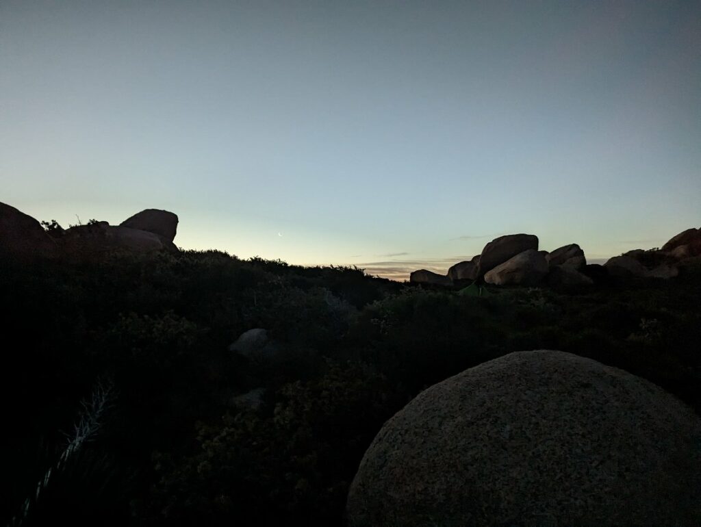Am 4. Tag starte ich vom Zeltplatz in Mount Laguna schon 5:45 Uhr! Wenn man hier bis um 6 Uhr schlaeft, ist man Langschlaefer. Wir wandern knapp 19km (und erreichen zwischenzeitlich den 50-Meilen-Marker: Whoop Whoop!) zu einem Picknickplatz, an dem es Wasser geben sollte. Aber was fuer welches. Der offene Tank ist mit 10cm hohen Wasser bzw. Algen gefuellt, in dem auch Raupen und Insekten schwimmen. Baeh!! Erfahrene Weitwanderer erklaeren uns, dass das gar nicht so schlecht aussieht und wir uns auf Schlimmeres einstellen muessen. WHAAAT!? Ich traue mich und filtere 1 Liter des Wassers. Danach ist mein Filter verstopft. Eine kurze Geschmacksprobe: Schmeckt OK. Trotzdem freue ich mich, als uns eine Frau auf dem Parkplatz 2l Wasser anbietet. Nehmen wir gern. Das Ekelwasser nehme ich als Notfall mit. Wir wandern noch 6km durch die gruene Wuestenlandschaft. Es gibt sehr viele Raupen, die immer staerker die Buesche bevoelkern. werden. Wenn wir stehen bleiben, hoeren wir ein Knistern. Das sind die Fressgeraeusche der Raupen! Jetzt bemerken wir auch, dass die Buschblaetter ganz abgefressen sind. Wir quetschen uns durch den gruenen Raupentunnel und kommen an einem wundervollem Zeltplatz mit genialer Aussicht. Bis zur naechsten Wasserquelle sind es zwar nur einige Kilometer, aber wir haben noch genug Wasser und wollen an diesem Platz bleiben. Es sind nur Manon und ich. Alle anderen sind bis zur Wasserquelle weitergezogen. Wir hoffen, dass wir alleine zelten koennen, um unser Angstgefuehl zu testen. Aber im Laufe des Abends gesellen sich noch einige dazu. Unter anderem ein Suedafrikaner namens Dieter. Dieter hat auch einen Schnurrbart. Der Name passt irgendwie. Er ist total nett und wir quatschen ein bisschen. Danach sucht sich jeder eine Ecke fuer sich und geniesst den Sonnenuntergang. Da Dieter das von einem Felsen ausmacht, erhaelt er von Manon den Trailnamen Simba. Er nimmt ihn an und ist ab jetzt Simba.