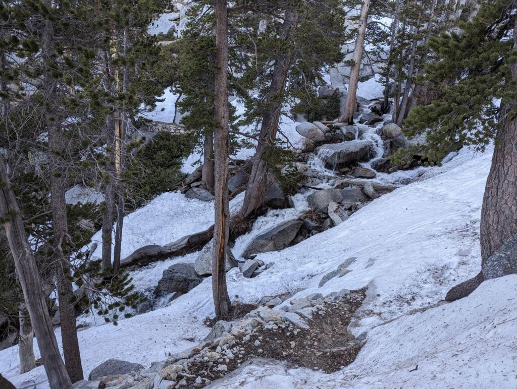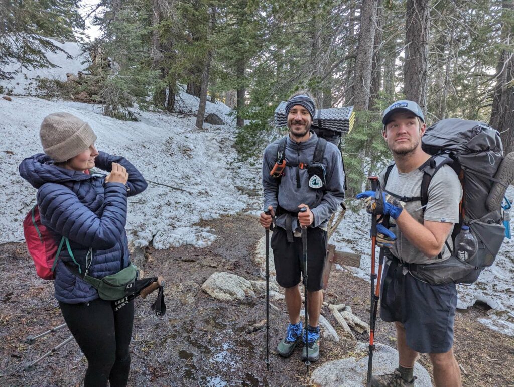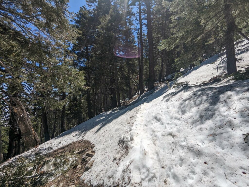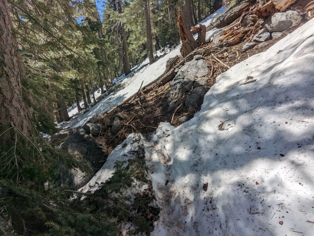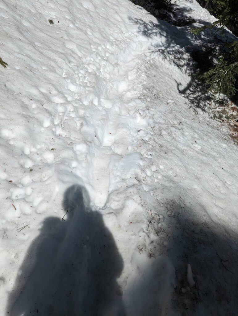 Am nächsten Tag laufe ich mit der aufgehenden Sonne los. Wir hatten nur 20km bis zum Zeltplatz vor dem Aufstieg – ein entspannter Tag. Die Landschaft wird immer schöner vor allem in dem warmen Morgenlicht. Es gibt viele umgestürzte Bäume teils an abschüssigen Stellen zu überwinden. Das macht das Vorankommen etwas mühsam. In Teilbereichen ist der Weg sehr schmal und es geht steil ab. Das hätten wir gestern nicht mehr geschafft. Gut, dass wir den Tag aufgeteilt haben. Ich habe viel Energie und die anderen holen mich nicht, wie üblich, ein. Nach einer fast einstündigen Frühstückspause laufe ich also weiter und trete fast auf eine Eidechse. In diesem Gebiet sind sie etwas dumm und flüchten nicht ins sichere Gebüsch sondern manchmal direkt in meine Richtung. Erste Schneefelder kreuzen den Weg und werden dichter. An einem Bach mache ich Pause und treffe überraschend Olivier! Große Freude. Er war auch bei Scout und Frodo. Wir verbringen die Mittagspause zusammen und er zieht weiter. Ich warte auf die anderen. Zusammen gehen wir los und marschieren durch den nun vollständig den Weg bedeckenden Schnee. Uff. Mühsam. Wir kommen langsam voran, rutschen viel aus und verlieren den Weg. Macht nicht so viel Spaß. Als wir das Camp erreichen, bin ich mir nicht sicher, ob ich mit auf den Gipfel gehen soll.