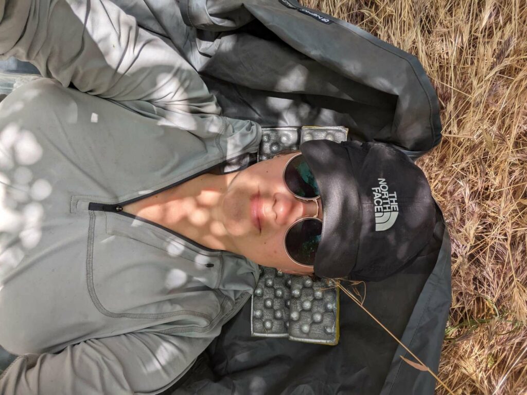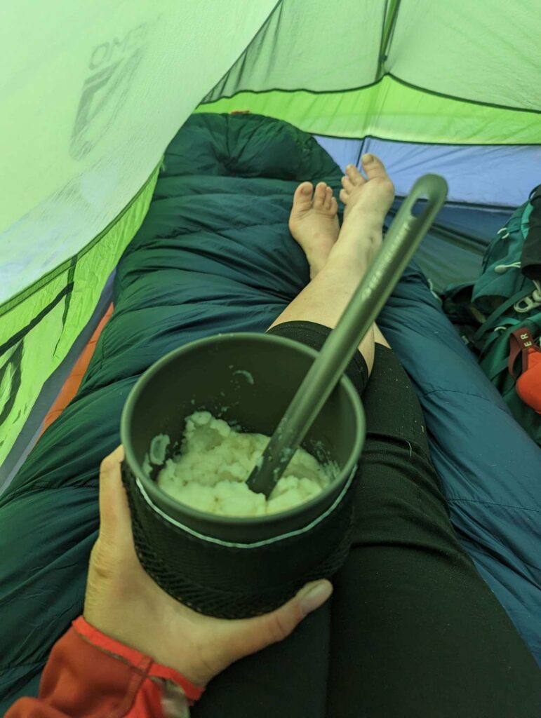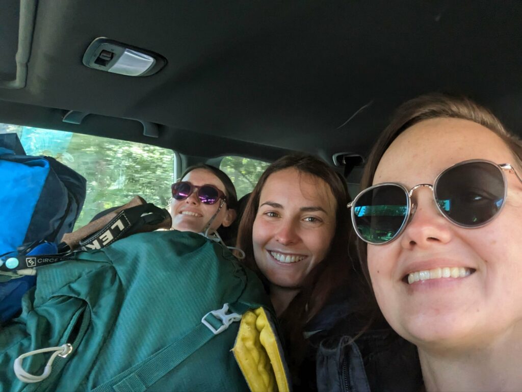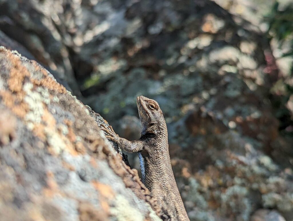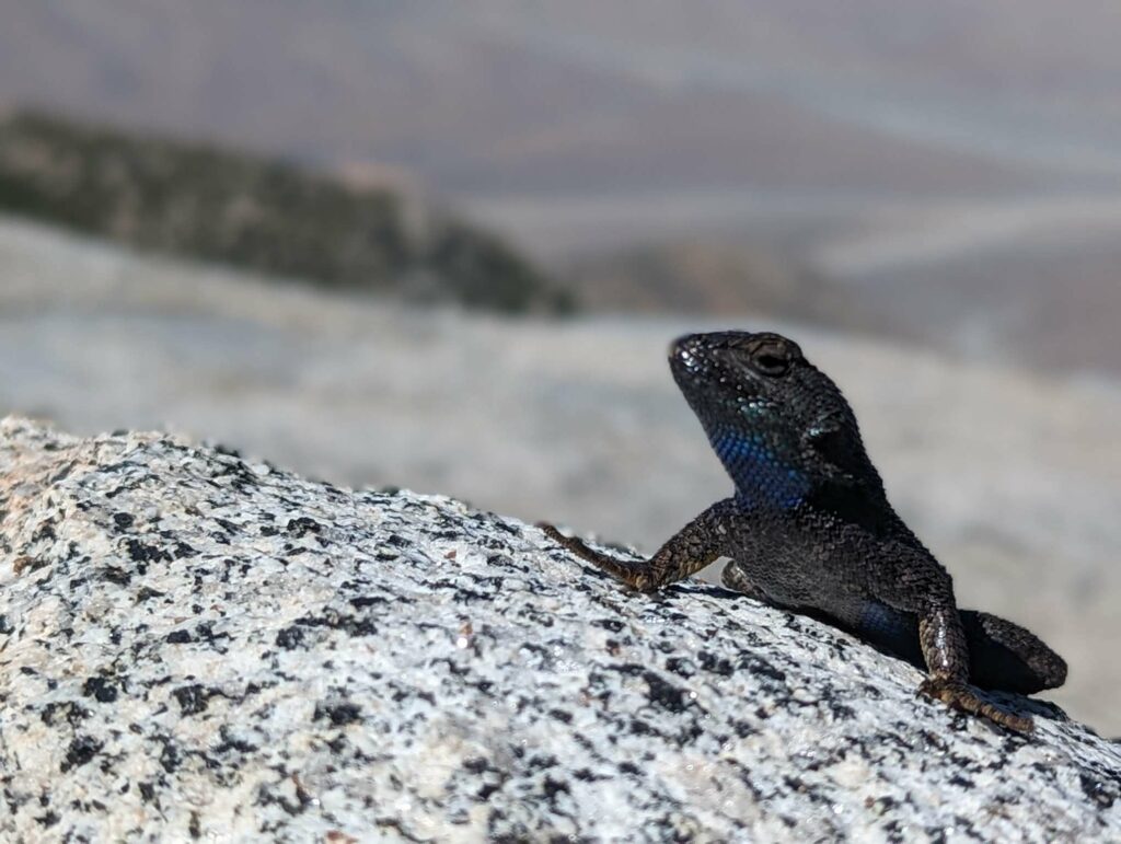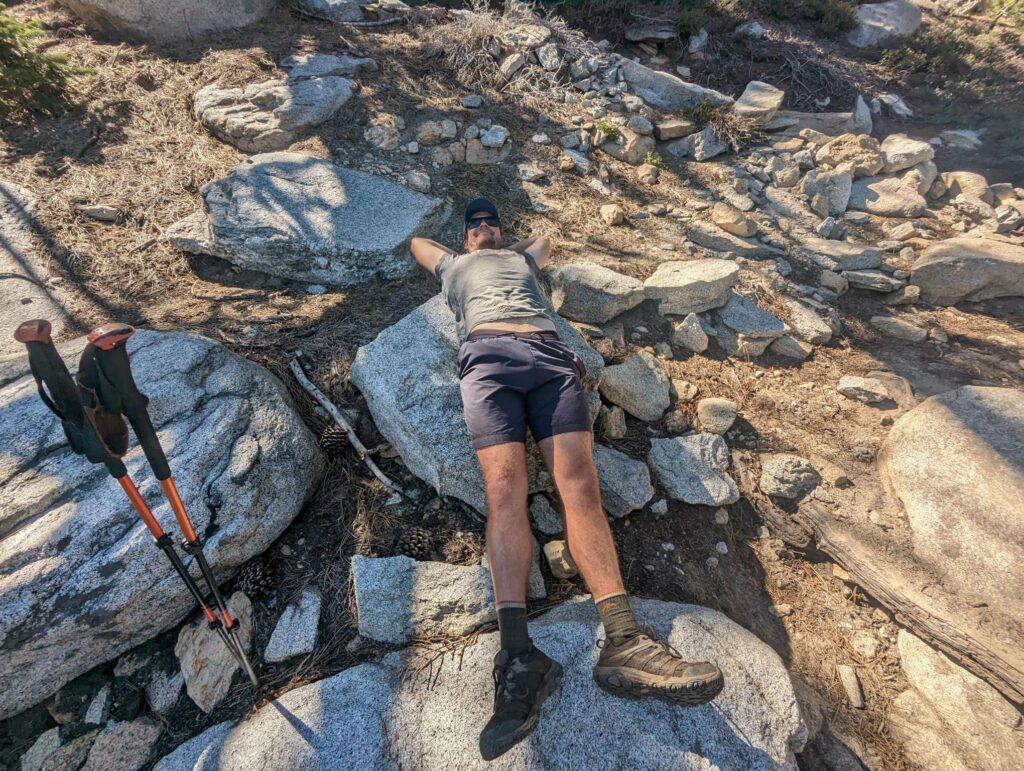 Am nächsten Tag laufe ich mit der aufgehenden Sonne los. Wir hatten nur 20km bis zum Zeltplatz vor dem Aufstieg – ein entspannter Tag. Die Landschaft wird immer schöner vor allem in dem warmen Morgenlicht. Es gibt viele umgestürzte Bäume teils an abschüssigen Stellen zu überwinden. Das macht das Vorankommen etwas mühsam. In Teilbereichen ist der Weg sehr schmal und es geht steil ab. Das hätten wir gestern nicht mehr geschafft. Gut, dass wir den Tag aufgeteilt haben. Ich habe viel Energie und die anderen holen mich nicht, wie üblich, ein. Nach einer fast einstündigen Frühstückspause laufe ich also weiter und trete fast auf eine Eidechse. In diesem Gebiet sind sie etwas dumm und flüchten nicht ins sichere Gebüsch sondern manchmal direkt in meine Richtung. Erste Schneefelder kreuzen den Weg und werden dichter. An einem Bach mache ich Pause und treffe überraschend Olivier! Große Freude. Er war auch bei Scout und Frodo. Wir verbringen die Mittagspause zusammen und er zieht weiter. Ich warte auf die anderen. Zusammen gehen wir los und marschieren durch den nun vollständig den Weg bedeckenden Schnee. Uff. Mühsam. Wir kommen langsam voran, rutschen viel aus und verlieren den Weg. Macht nicht so viel Spaß. Als wir das Camp erreichen, bin ich mir nicht sicher, ob ich mit auf den Gipfel gehen soll.