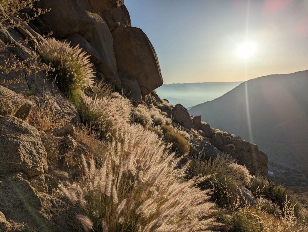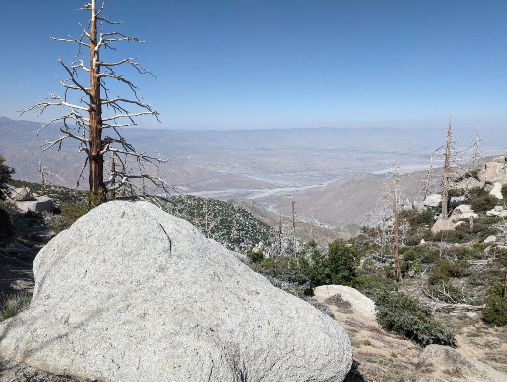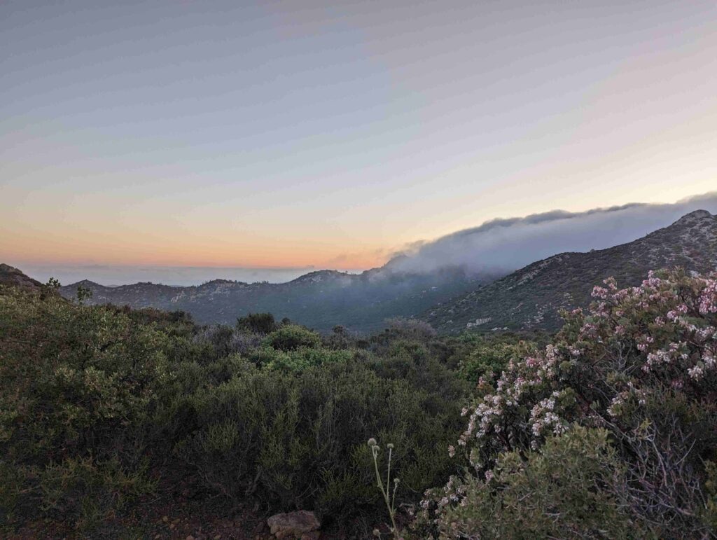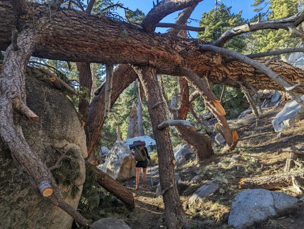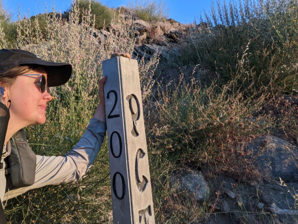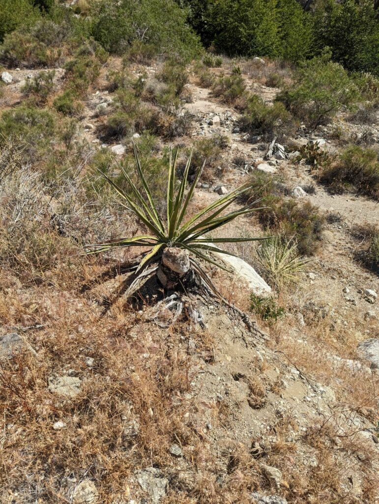 Die Abfahrt aus Idyllwild verläuft stressig. In der Bibiothek bin ich vertieft in meinen Blogbeitrag und übersehe die Anrufe der Gruppe. Als ich endlich mein Handy checke, packe ich alles überhastet ein und sprinte los. Zum Glück sind sie nicht so weit entfernt und waren bisher noch nicht erfolgreich, eine Mitfahrgelegenheit zu bekommen. Dann halten innerhalb kurzer Zeit gleich 2 Autos und wir kommen alle zurück zum Trail. Der Plan ist straff. In 2 Tagen so nah wie möglich an den San Jacinto kommen und am dritten Tag aufsteigen. Da wir erst spät loslaufen, endet der Tag heute im Dunkeln nach etwa 12km. Ich bin diesmal schon als 2. im Camp.
