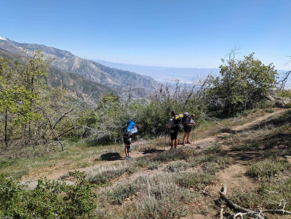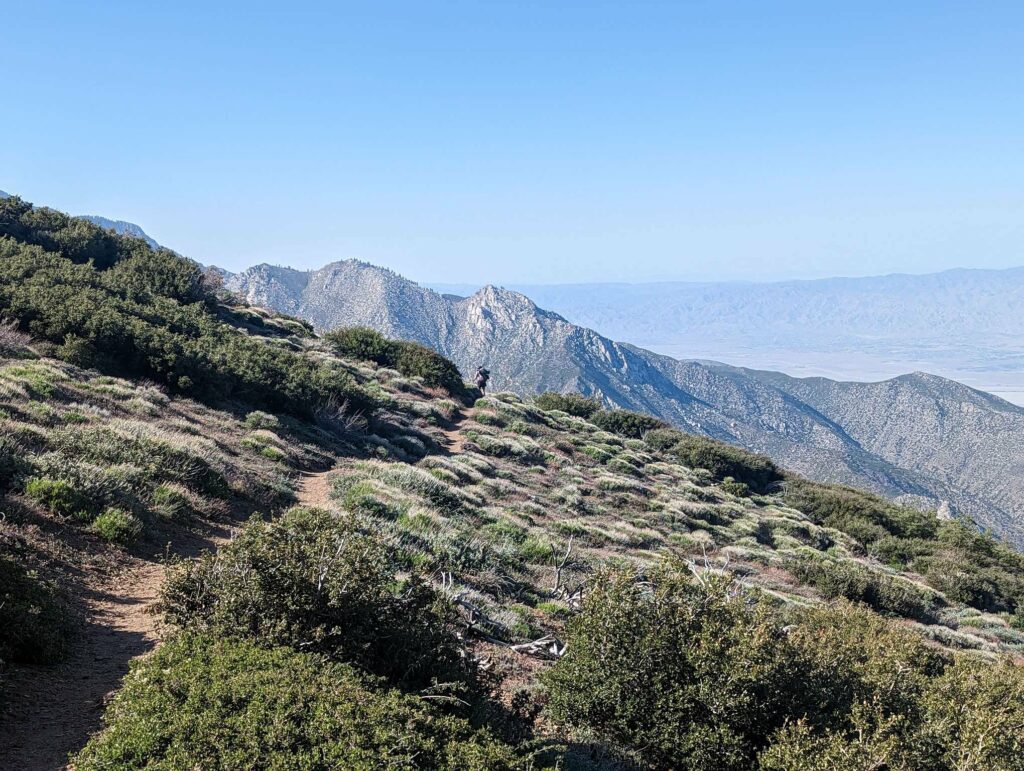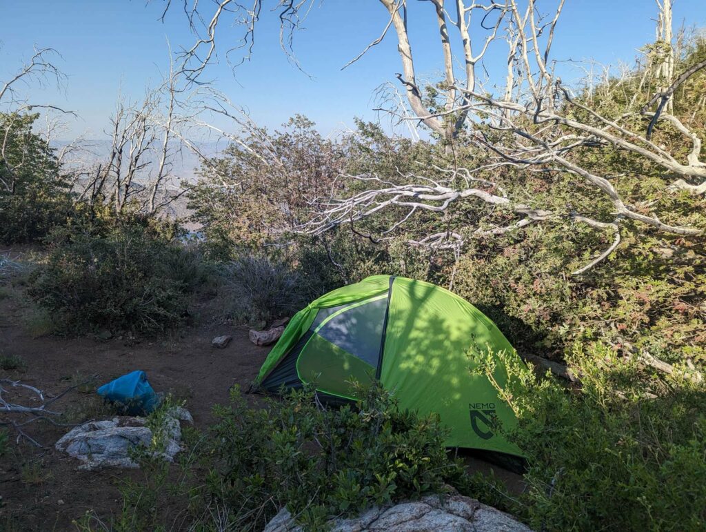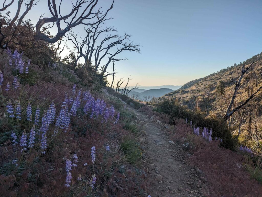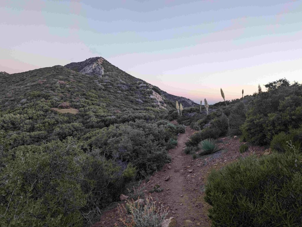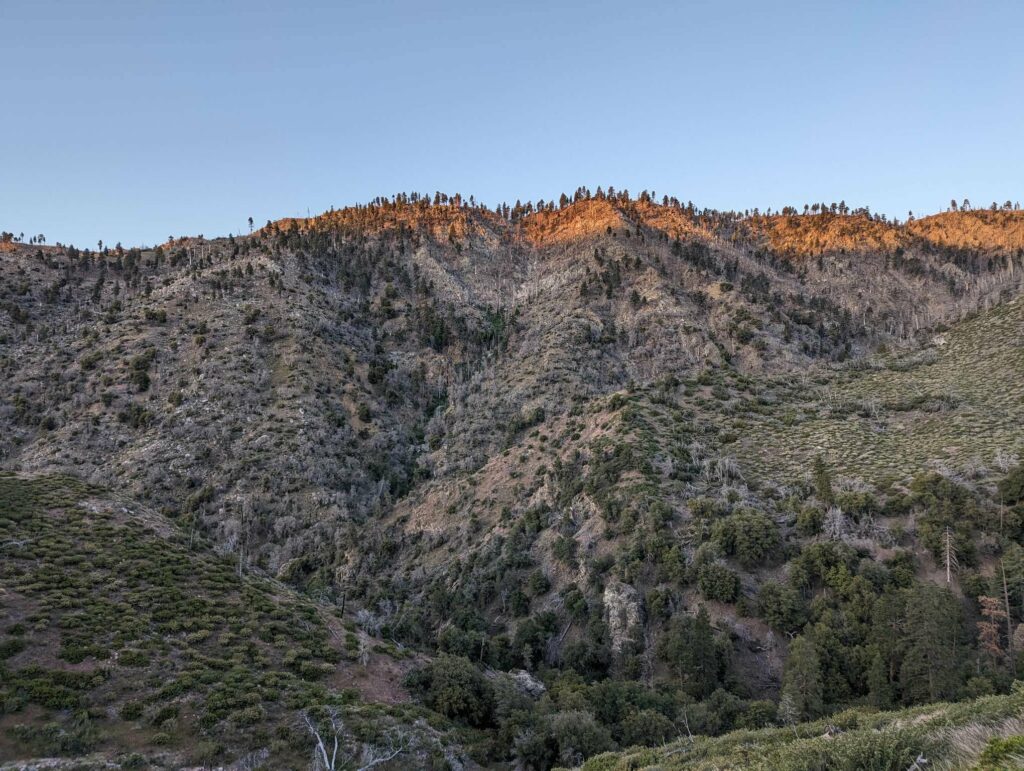 Die Abfahrt aus Idyllwild verläuft stressig. In der Bibiothek bin ich vertieft in meinen Blogbeitrag und übersehe die Anrufe der Gruppe. Als ich endlich mein Handy checke, packe ich alles überhastet ein und sprinte los. Zum Glück sind sie nicht so weit entfernt und waren bisher noch nicht erfolgreich, eine Mitfahrgelegenheit zu bekommen. Dann halten innerhalb kurzer Zeit gleich 2 Autos und wir kommen alle zurück zum Trail. Der Plan ist straff. In 2 Tagen so nah wie möglich an den San Jacinto kommen und am dritten Tag aufsteigen. Da wir erst spät loslaufen, endet der Tag heute im Dunkeln nach etwa 12km. Ich bin diesmal schon als 2. im Camp.