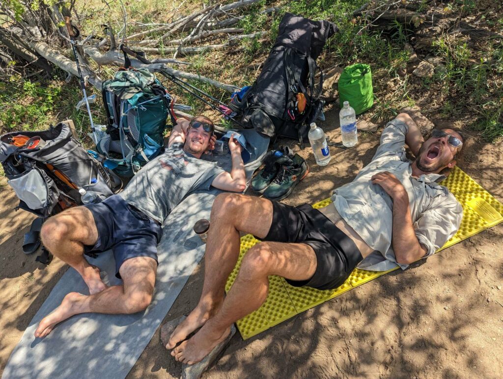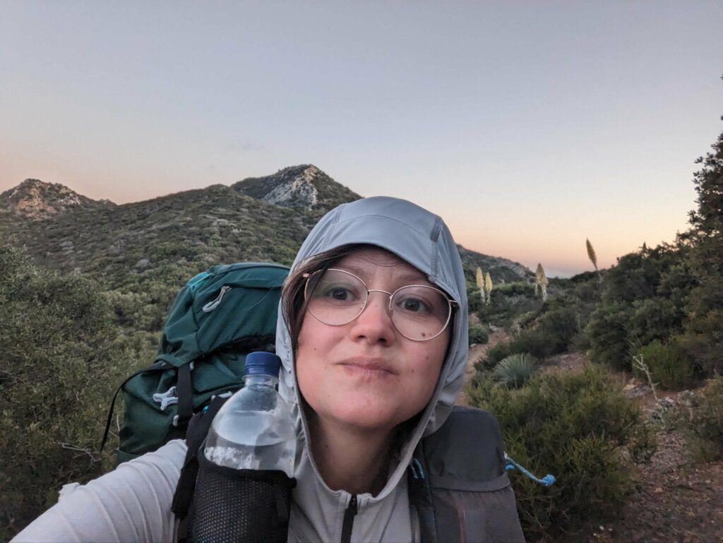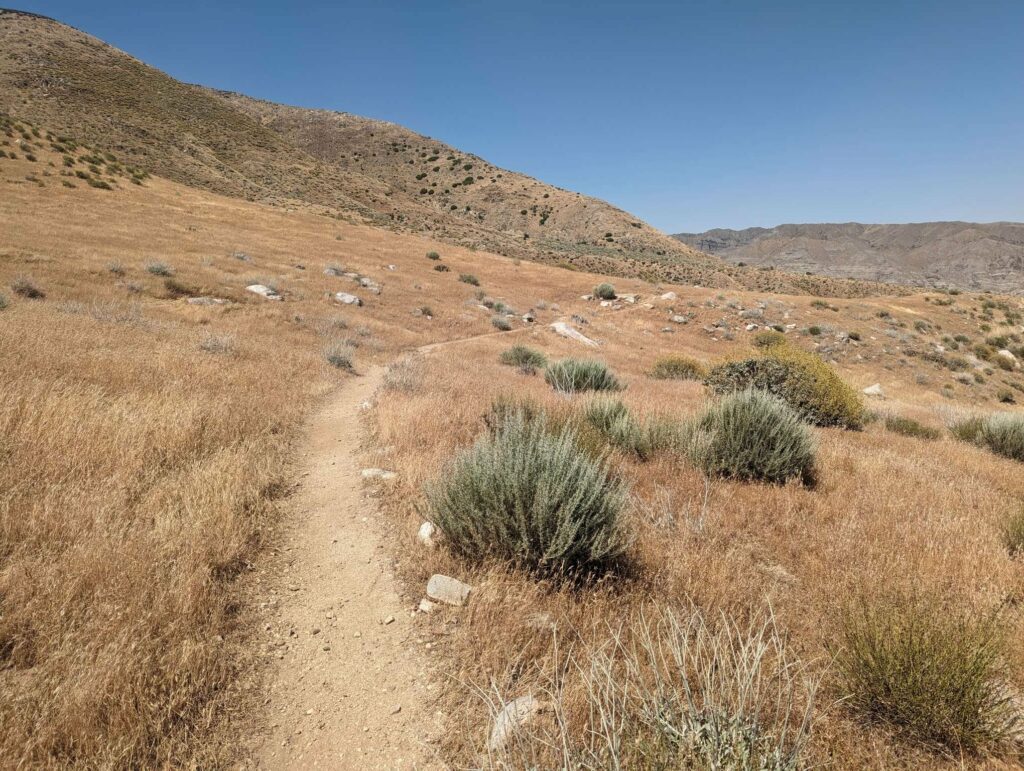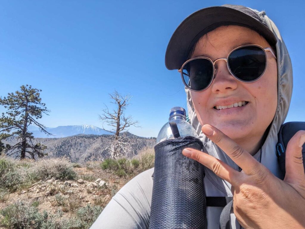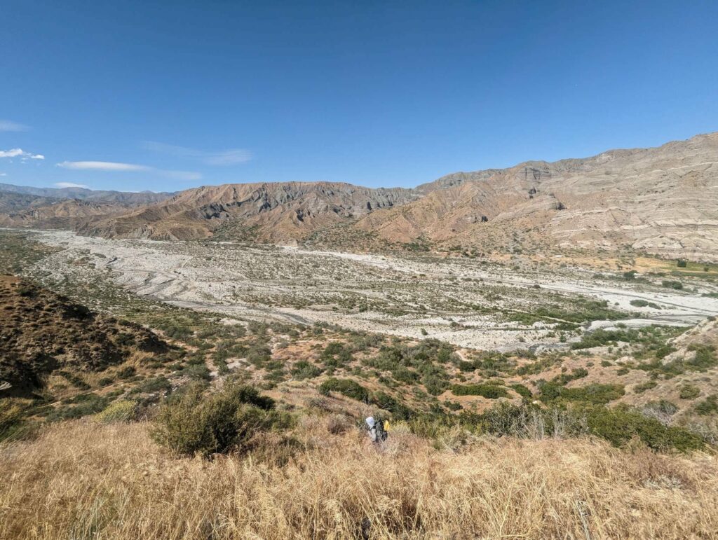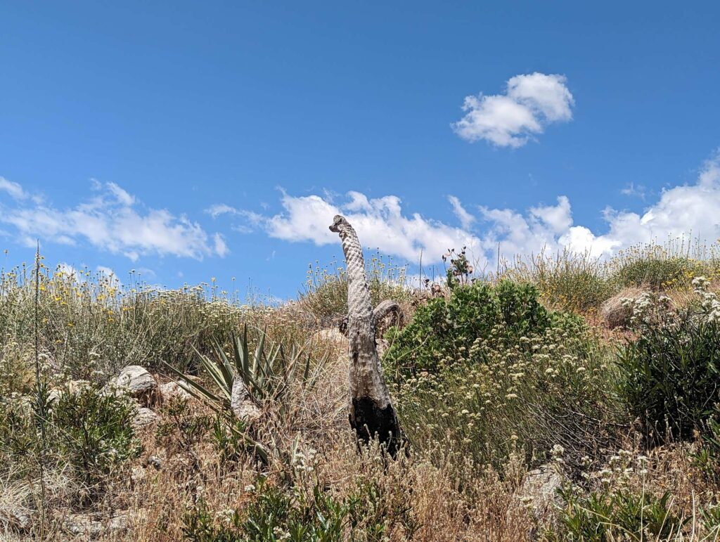 Am kommenden Tag nehmen wir uns zu viel vor. Es geht viel bergauf, teilweise sehr steil und es ist heiß! Die Landschaft ist eindrucksvoll. Die Hügel werden etwas schroffer. Wir laufen viel gemeinsam und quälen uns die Berge hoch. Clumsy höre ich von Weitem in Dänisch fluchen. Mit Wasser sieht es in diesem Abschnitt mau aus. Wir nehmen also zähneknirschend die 200 mühsam erkämpften Hohenmeter in Kauf und steigen ab zur einzigen Wasserquelle in der Nähe. Dort warten schon Doodoo und Husband, denen der heutige Tag nicht so viel ausmacht. Da zusätzlich zu den 200 Höhenmeter von der Wasserquelle noch 800 bis zum heutigen Zeltpltz dazukommen und wir schon fertig sind, entscheiden wir, den Tag zu verkürzen. Für den Aufstieg auf den San Jacinto brauchen wir sowieso etwas mehr Energie. Den Gipfel nehmen wir dann erst einen Tag später im Angriff. So erreichen wir das Camp schon 17:30 Uhr und können uns etwas von dem Tag erholen.