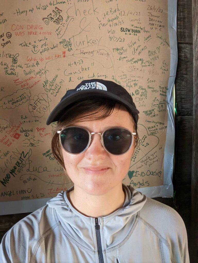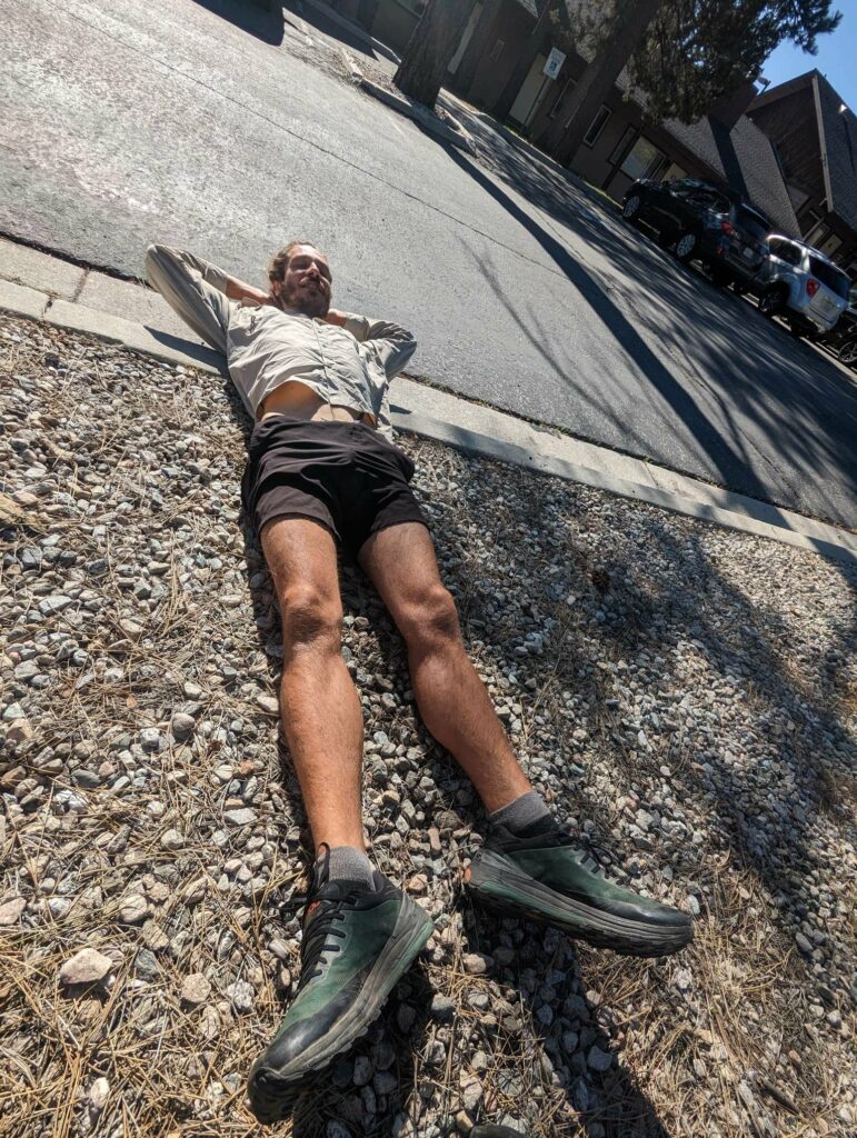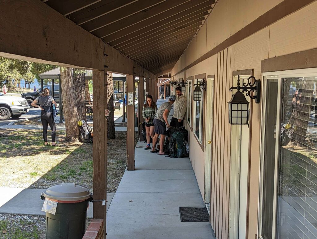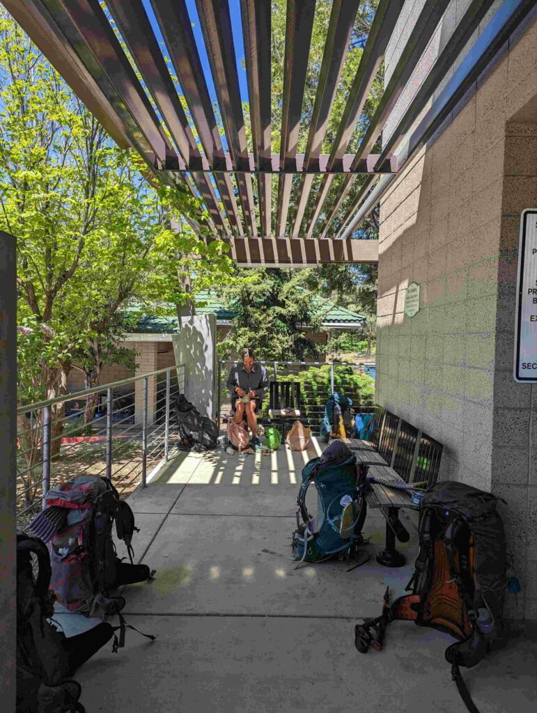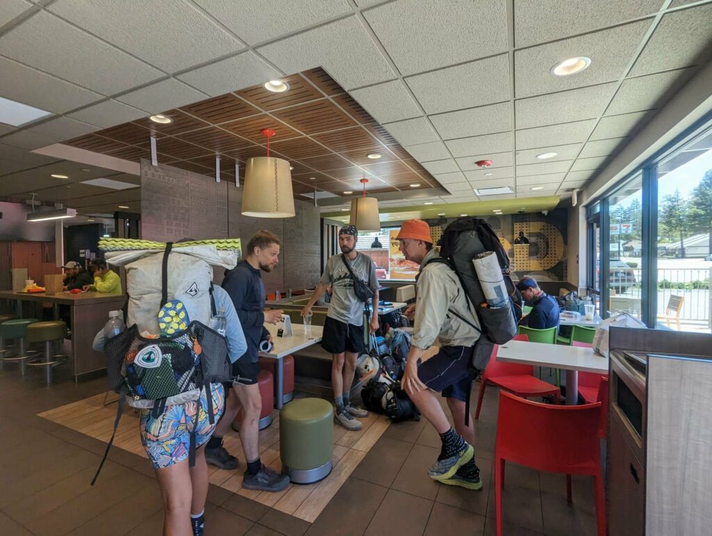 Am nächsten Tag bin ich zeitig wach und nichts hält mich im Zelt. Ich starte vor allen anderen, aber weiß, dass ich am Highway auf sie warten muss. Alleine will ich nicht hitchhiken. Die 10 km ziehen sich seeeeeehr lange. Die Natur wied unterbrochen von Häusern und dann höre ich den Highway. Dort angekommen, treffe ich auf Ales und Sam (kenne ich von Scout and Frodo). Sie trinken 8 Uhr morgens Bier… Haben sie gefunden und fühlten sich danach. Wieder nutze ich die Gelegenheit und schließe mich an. Kaum am Highway mit dem Daumen hoch hingestellt, ruft es hinter uns. Eine Frau war mit ihrem Hund Gassi und bietet uns eine Fahrt in die Stadt an! Freude! Sie gibt uns eine kleine Rundfahrt und Tipps für Restaurants. So nett! Als sie uns rauslässt, schließe ich mich den Jungs an und folge ihnen zu MC Donalds. Meine Stimmung ist sehr gedrückt, weil ich nichts von meiner Gruppe höre (haben sie mich schon vergessen) und weil meine Kreditkarte gesperrt ist. Ohne Geld bin ich aufgeschmissen. Ales gibt mir Bargeld und ich überweise es ihm zurück. Es reicht für eine Nacht. Vom Motel kann ich dann anrufen und meine Karte entsperren lassen. Plötzlich sehe ich einen bekannten orangefarbenen Hut und dann einige bekannte Gesichter von Weitem. Ich stürme raus und renne zu Emma, Jason, Maks, Alex und Lauren. Allgemeines Umarmen und Freude. Sie wollten gerade zurück zum Trail, aber kommen geschlossen mit zu MC Donalds. Alex lässt mich sein Handy benutzen und ich kann mein Kreditkartenproblem klären. Maks gibt mir zur Sicherheit nochmal etwas Bargeld. The trail provides. Das stimmt wirklich. Glücklich und vollgemampft gehe ich zum Motel. Wegen eines Fehlers bekomme ich eine Familiensuite! Nur für mich allein!!! Ich dusche, wasche meine Klamotten, telefoniere mit Cyril, kaufe etwas zu essen und genieße einen schönen ruhigen Abend. Am nächsten Tag trudeln zuerst Manon und Husband ein und später treffen wir Max und Jessy. Es ist schön, alle zu sehen! Abends kommen noch Clumsy, Apollo und Eduardo an. Sie nehmen ein Zimmer nebenan. Sie schlafen zu sechst im selben Apartment wie ich allein. Aber ich brauche einen Raum für mich zum Zurückziehen. Nach einem Monat ohne Privatsphäre wird es Zeit. Jeder hat viel zu berichten. Clumsy war sogar im Krankenhaus. Außerdem wurde ihr Zelt in ein Sandsturm zerstört. Aber das wäre alles ein eigener Beitrag… Wir genießen die Stadt, das Essen und die Annehmlichkeiten einer Zimmers. Max hat außerdem Kontakt zu einer Physiotherapeutin aufgenommen, die uns um Motel besucht und einige Übungen zeigt.