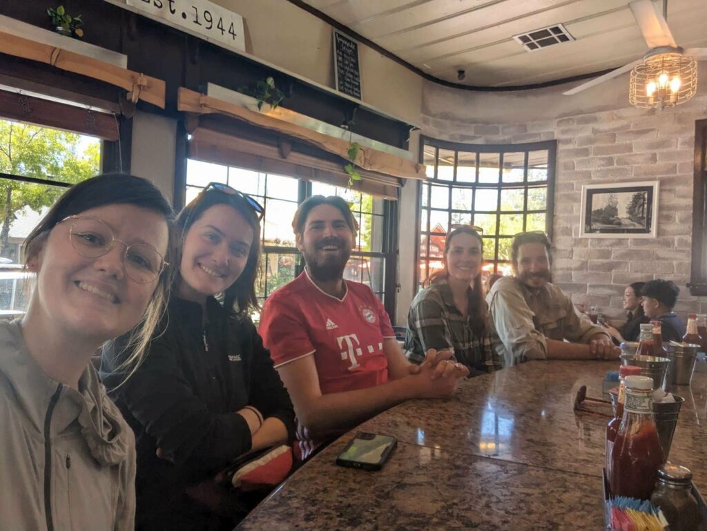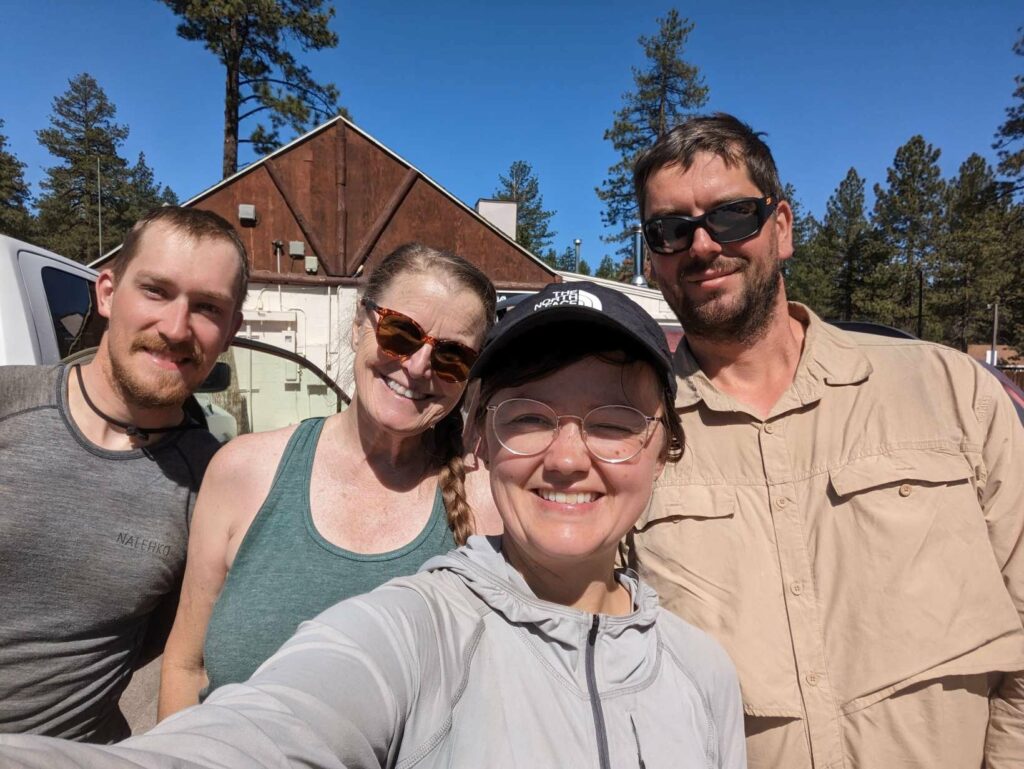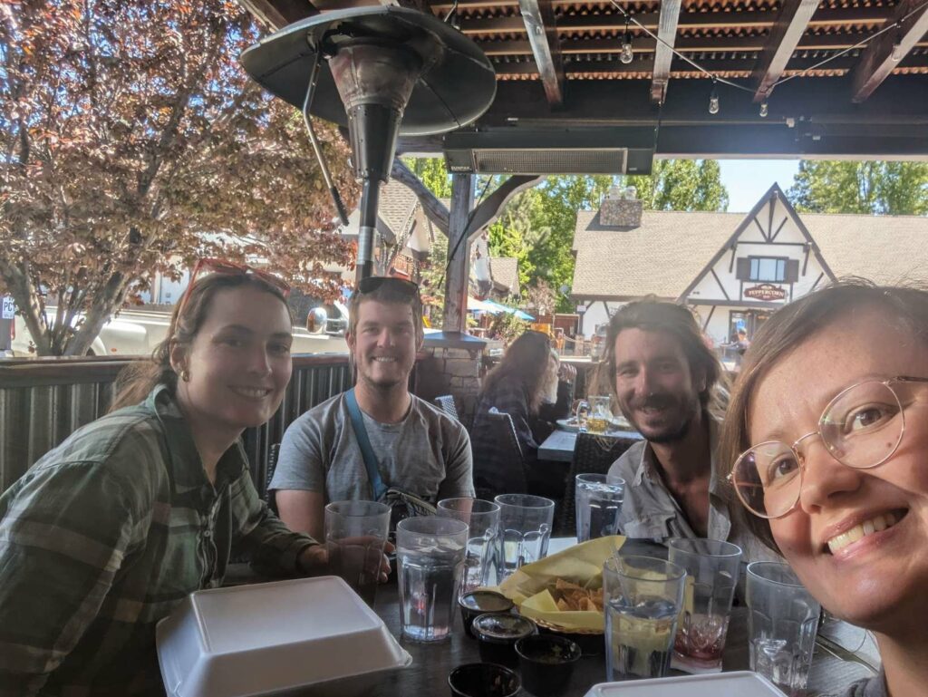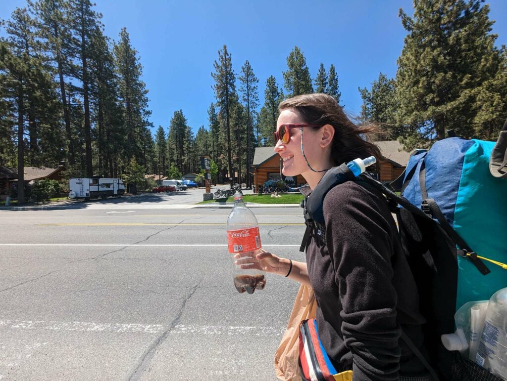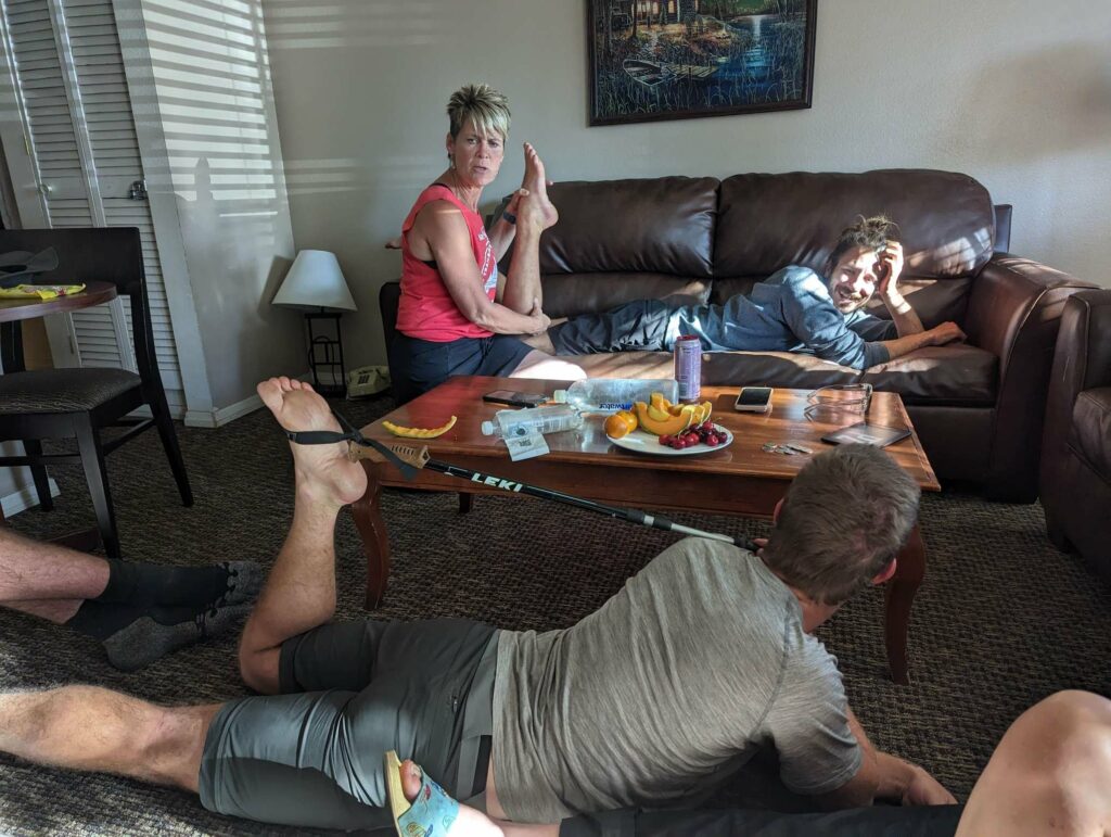 Am nächsten Tag bin ich zeitig wach und nichts hält mich im Zelt. Ich starte vor allen anderen, aber weiß, dass ich am Highway auf sie warten muss. Alleine will ich nicht hitchhiken. Die 10 km ziehen sich seeeeeehr lange. Die Natur wied unterbrochen von Häusern und dann höre ich den Highway. Dort angekommen, treffe ich auf Ales und Sam (kenne ich von Scout and Frodo). Sie trinken 8 Uhr morgens Bier… Haben sie gefunden und fühlten sich danach. Wieder nutze ich die Gelegenheit und schließe mich an. Kaum am Highway mit dem Daumen hoch hingestellt, ruft es hinter uns. Eine Frau war mit ihrem Hund Gassi und bietet uns eine Fahrt in die Stadt an! Freude! Sie gibt uns eine kleine Rundfahrt und Tipps für Restaurants. So nett! Als sie uns rauslässt, schließe ich mich den Jungs an und folge ihnen zu MC Donalds. Meine Stimmung ist sehr gedrückt, weil ich nichts von meiner Gruppe höre (haben sie mich schon vergessen) und weil meine Kreditkarte gesperrt ist. Ohne Geld bin ich aufgeschmissen. Ales gibt mir Bargeld und ich überweise es ihm zurück. Es reicht für eine Nacht. Vom Motel kann ich dann anrufen und meine Karte entsperren lassen. Plötzlich sehe ich einen bekannten orangefarbenen Hut und dann einige bekannte Gesichter von Weitem. Ich stürme raus und renne zu Emma, Jason, Maks, Alex und Lauren. Allgemeines Umarmen und Freude. Sie wollten gerade zurück zum Trail, aber kommen geschlossen mit zu MC Donalds. Alex lässt mich sein Handy benutzen und ich kann mein Kreditkartenproblem klären. Maks gibt mir zur Sicherheit nochmal etwas Bargeld. The trail provides. Das stimmt wirklich. Glücklich und vollgemampft gehe ich zum Motel. Wegen eines Fehlers bekomme ich eine Familiensuite! Nur für mich allein!!! Ich dusche, wasche meine Klamotten, telefoniere mit Cyril, kaufe etwas zu essen und genieße einen schönen ruhigen Abend. Am nächsten Tag trudeln zuerst Manon und Husband ein und später treffen wir Max und Jessy. Es ist schön, alle zu sehen! Abends kommen noch Clumsy, Apollo und Eduardo an. Sie nehmen ein Zimmer nebenan. Sie schlafen zu sechst im selben Apartment wie ich allein. Aber ich brauche einen Raum für mich zum Zurückziehen. Nach einem Monat ohne Privatsphäre wird es Zeit. Jeder hat viel zu berichten. Clumsy war sogar im Krankenhaus. Außerdem wurde ihr Zelt in ein Sandsturm zerstört. Aber das wäre alles ein eigener Beitrag… Wir genießen die Stadt, das Essen und die Annehmlichkeiten einer Zimmers. Max hat außerdem Kontakt zu einer Physiotherapeutin aufgenommen, die uns um Motel besucht und einige Übungen zeigt.