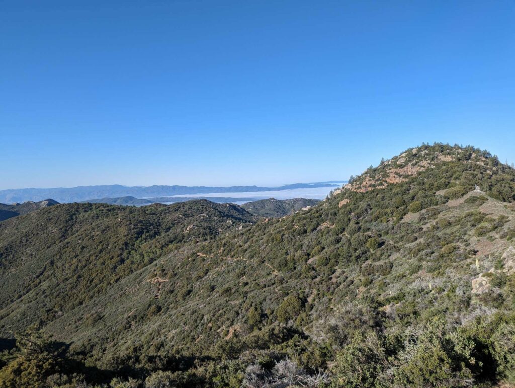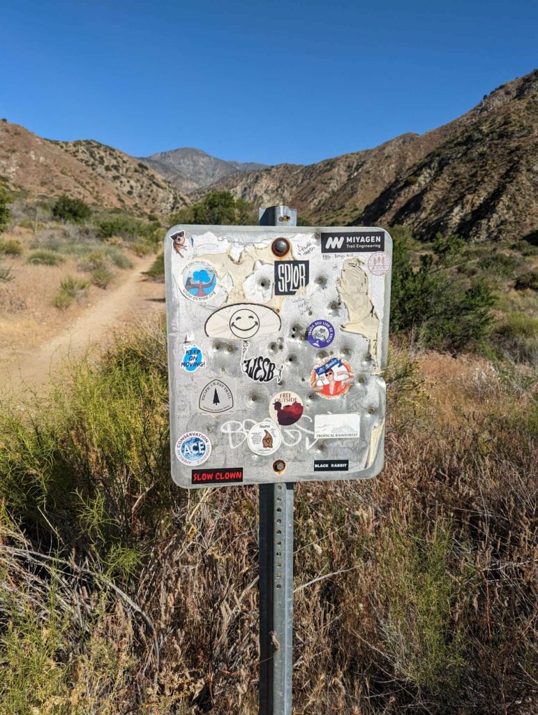 Voller neuem Selbstbewusstsein starte ich in den nächsten Tag. Nur noch eine Nacht vor der Stadt! Die Aussicht auf eine Dusche und ein Bett gibt mir ungeahnte Energie. Je weiter ich heute komme, desto eher bin ich morgen in der Stadt. Es geht aber 1500m nach oben und zwar ohne Wasser, was 4kg Zusatzgewicht bedeutet. Nach 5km erreiche ich die letzte Wasserquelle und treffe auf Olivier, der gerade aus dem Zelt kriecht. Er ist mitgenommen vom gestrigen Tag. Auch die anderen beiden. Die 4. und 5. Person der Gruppe sind schon unterwegs. Sie wollen heute noch in die Stadt, die 42km entfernt ist… Ich bin mir nicht sicher, ob es gut ist, wenn weniger schnelle Leute mit superschnellen mithalten wollen. Olivier ist verletzt und will es heute langsam angehen lassen. Den ganzen Tag über überholen wir uns gegenseitig. Teil seiner reduzierten Gruppe sind Puffer und Rawdog. Wir quatschen, wenn wir uns sehen. Fast gehöre ich zu dieser kleinen Gruppe. Der Weg ist nicht so schwer und ich schwebe nur so dahin. Ich komme am 400km – Marker vorbei. Außerdem an einer Art Zoo für Filmtiere (LA ist nicht weit) und einer Hütte mitten im Wald ohne Fenster und Türen (könnte Kulisse eines Horrorfilms sein). Als ich schon 16 Uhr am geplanten Platz ankomme, entscheide ich mich, mit den anderen zum nächsten Platz zu gehen. Dort angekommen schaue ich nach und stelle erstaunt fest, dass ich 36km gewandert bin! Und ich bin nicht mal sehr erschöpft. Genial! Morgen habe ich nur noch 10km zum Highway. Puffer und Co. klatschen und beglückwünschen mich zu meinem ersten 20-Meilen Tag. Ich bin stolz und schlafe wunderbar.