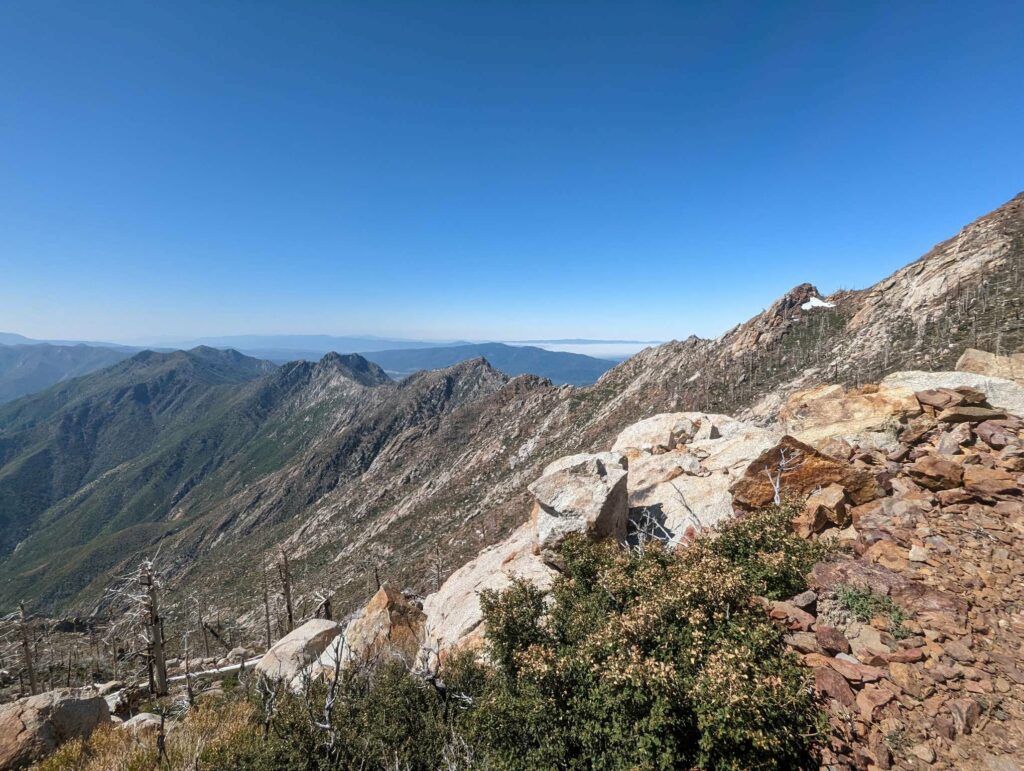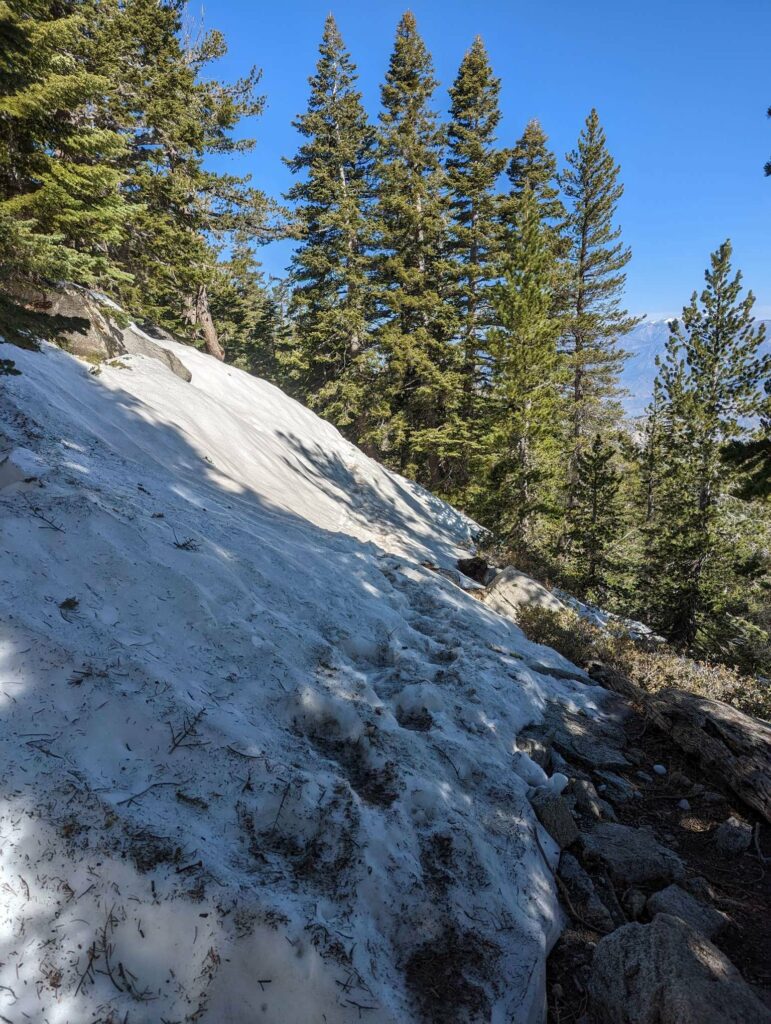 Früh morgens brechen wir zum Gipfel auf. Es geht wieder durch Schnee und ich rutsche ständig aus. Ich weiß, dass nach dem Gipfel noch eine schwierige Stelle (Fuller Ridge) bevorsteht und habe Zweifel, dass ich es schaffen kann. Am Abzweig entscheide ich, nicht mit zum Gipfel zu gehen. Während die anderen abbiegen, gehe ich allein weiter und fühle mich einsam und ein bisschen wie ein Loser. Als ich an zwei Flüssen ankomme, die schnell den Berg runterrauschen, muss ich mich bei der Überquerung aber so konzentrieren, dass die Gefühle erstmal in den Hintergrund treten. Nach einigen schneefreien Kilometern komme ich schließlich zur Fuller Ridge, dem Nordhang, an dem es zurück in die Wüste geht. Es ist steil und komplett schneebedeckt. Es geht extrem langsam voran. Ich konzentriere mich und mache Babyschritte, damit ich nicht abrutsche. Für 100m brauche ich 20 Minuten. Nur zweimal rutsche ich auf meinem Po, aber nur kurz und nicht den steilen Abhang. Mehrmals komme ich dem Weg ab und klettere wieder zurück. Es gibt so viele Fußspuren hier. Wie man den Weg ohne Apo finden soll, ist mir ein Rätsel. Als der Schnee endlich weniger zu werden scheint, bin ich erleichtert. Jetzt wechseln sich Trail uns Schneefelder ab und schließlich ist der Schnee weg. Ich bin stolz, dass ich das alleine geschafft habe. Nach einer Pause geht es weiter Richtung Wüstental auf das es immer wieder Ausblicke gibt. Die Landschaft ist traumhaft. So viele Blumen. Es duftet herrlich! Ich schaffe an diesem Tag fast 28km und steige 1800 Höhenmeter ab. An der Zeltstelle sind schon 2 Mädels aus Kalifornien. Zum Glück ist hier noch Platz für mich, denn ich bin echt kaputt. Ich denke an die Gruppe und hoffe, dass sie ihren Tag gut geschafft haben. Es ist etwas bedrückend, nicht mit ihnen gemeinsam zu schlafen.