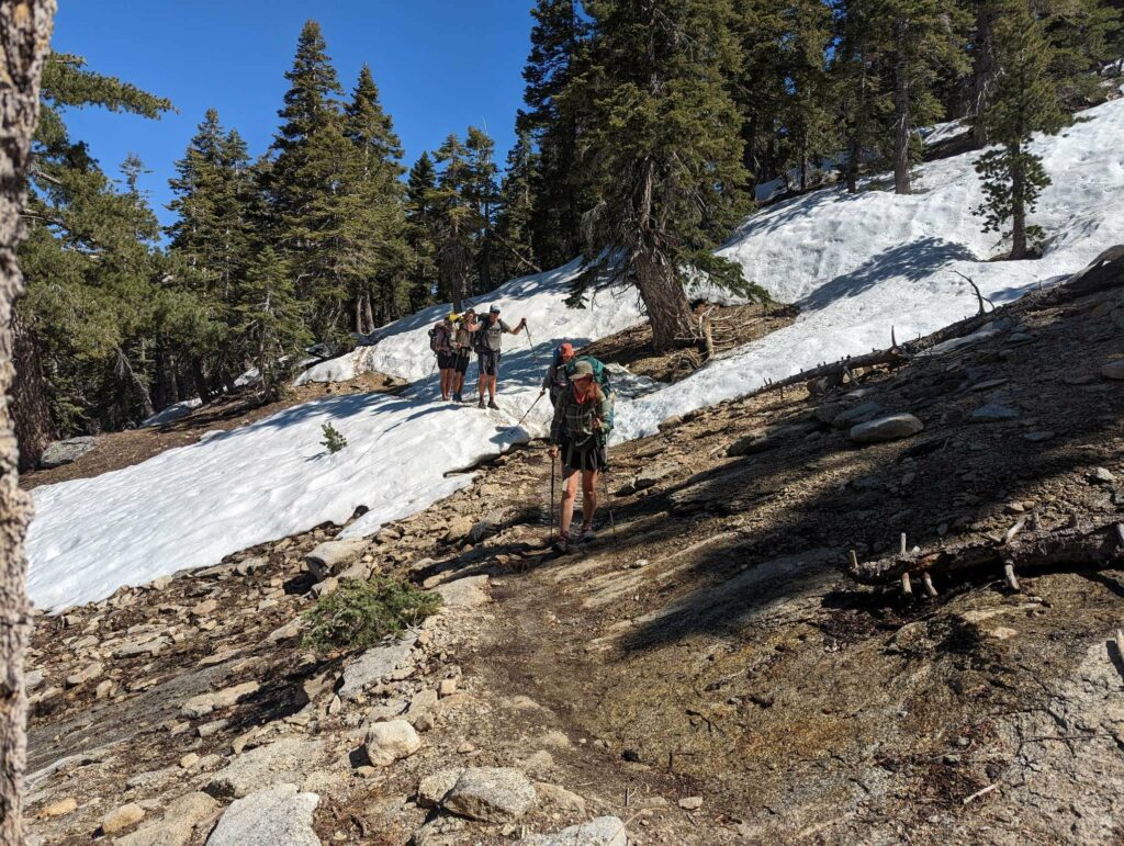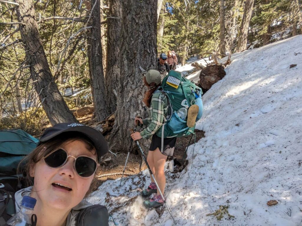 Was für eine vielseitige Woche! 428 km liegen hinter mir. Genau ein Zehntel des Weges. Mein Körper gewöhnt sich scheinbar langsam an seine neuen Abläufe, denn ich schaffe mehr Strecke. Zum ersten Mal wandere ich einen 20-Meilen-Tag (genau genommen 22,5 Meilen – 36km). Und zwar allein, denn ich bin die letzten 5 Tage ohne meine Gruppe unterwegs. Zum Wochenprogramm gehören außerdem Schnee, Mikrospikes, Flussdurchquerungen sowie neue und alte Gesichter. Nach 7 Tagen auf dem Trail freue ich mich auf 2 Nächte in einem Motelzimmer und eine Dusche.