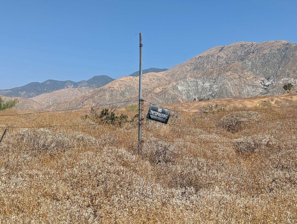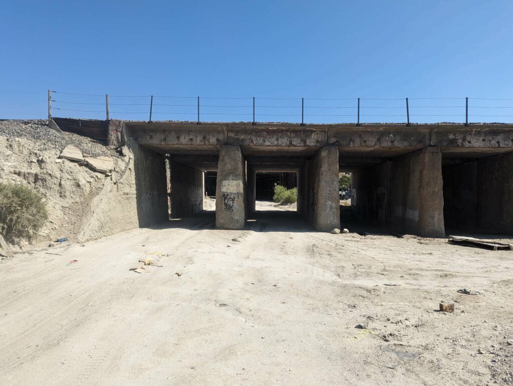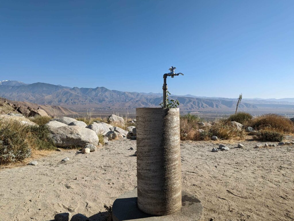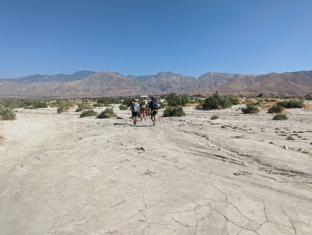 Am nächsten Morgen wache ich wieder gegen 4:45 Uhr auf und treffe eine Entscheidung: Ich werde versuchen bis zur nächsten Stadt durchzugehen. Ich habe noch genug Essen für 4 Tage. Es wird knapp, aber sollte reichen. Die Gruppe ist einen halben Tag hinter mir und sie wollen noch in einer anderen Stadt (Cabazon) anhalten. Außerdem habe ich schon von Leipzig für die ersten 3 Wochen einen Plan gemacht und entsprechend Unterkünfte reserviert. Die beiden vorherigen habe ich storniert, aber wenn ich in 4 Tagen ankomme, passt das genau mit meiner Reservierung. Also los! Ich schaffe das! Das Camp ist schnell abgebaut und ich düse los in Richtung Wüste vorbei an einem Camp mit vielen Zelten. Die Gruppe ist extrem schnell und holt mich teilweise ein. Im Tal angekommen gibt es eine Wasserquelle: Wie eine Fata Morgana erscheint der Wasserhahn. Ich fülle nach und nun erreicht mich auch der Rest der fremden Gruppe. Sie sind nett und wir wandern zusammen (=ich renne und sie wandern) bis zum Highway. Sie wollen eine Mittagspause in der Stadt machen. Als ich mich rumdrehe, sehe ich das Olivier auch zu dieser Gruppe gehört. Was für eine Überraschung. Ich habe nicht gedacht, dass ich ihn nochmal sehe. Er wandert sehr schnell. Unter der Autobahnbrücke (schrecklicher Ort) machen wir Pause und verabreden uns, am nächsten Tag gemeinsam die erste ernsthafte Flussdurchquerung zu bewältigen. Sie würden mich bei ihrem Tempo sicher einholen. Olivier will mir auch noch etwas Essen aus der Stadt mitbringen. Das ist sehr nett, dann muss ich nicht ganz so stark rationieren.