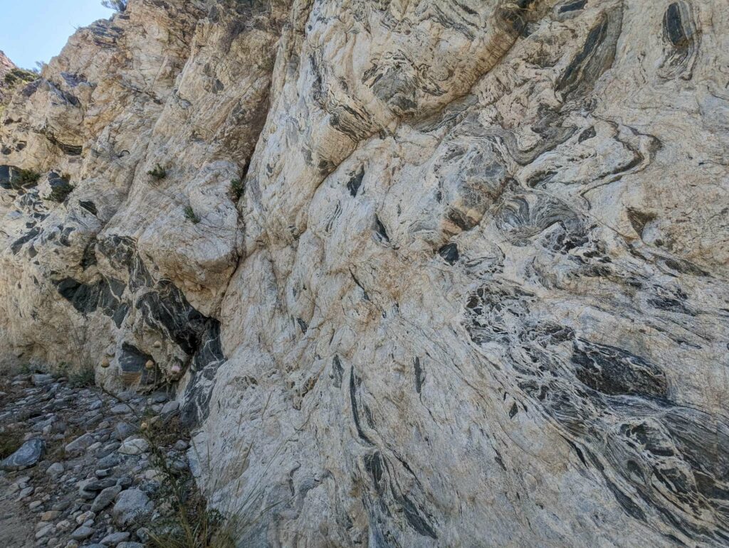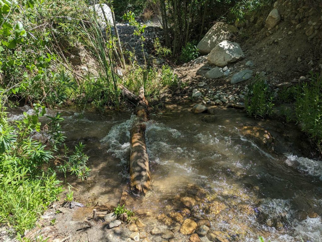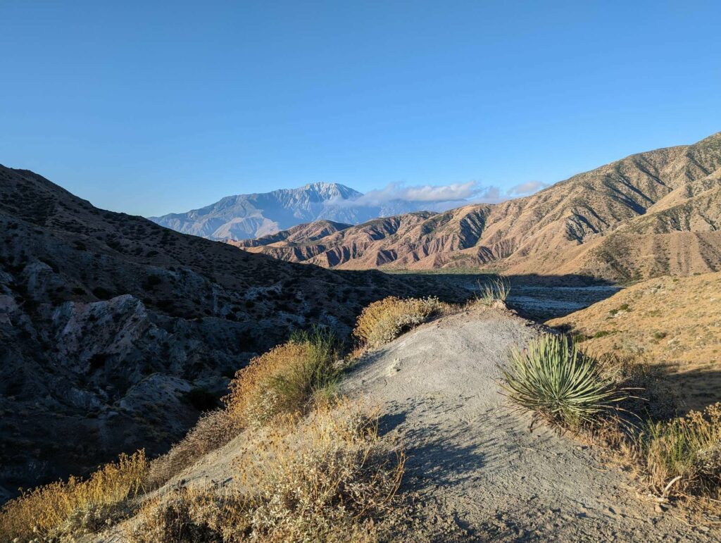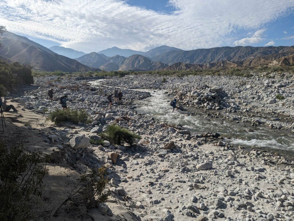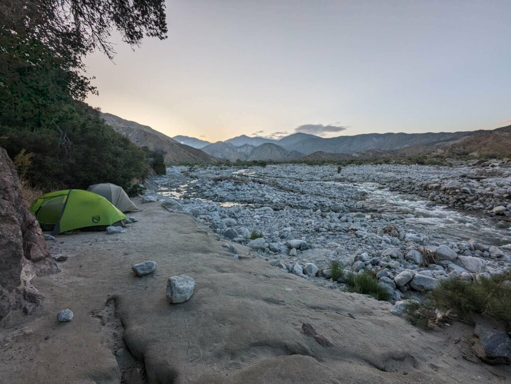 Was für eine schreckliche Nacht! Ich habe kaum geschlafen. Die ganze Nacht dieser Wind und das Geräusch des Flusses. Dazu die diffuse Angst vor einer Freshflood, denn ich campe direkt im Überflutungsbereich – wie dumm. Irgendwann schlafe ich doch ein und träume wild. Uff! Endlich Tageslicht, Zeit zu packen. Der Fluss ist genauso schnell wie tags zuvor. Die Wanderin namens Monica bricht zur selben Zeit auf und ich folge ihr. Die anderen sind irgendwo hinter mir und ich weiß nicht, ob sie nicht doch in der Stadt geblieben sind. Mit mulmigen Gefühl steige ich hinter ihr in das kalte Wasser. Stock, Schritt, Stock, Schritt, usw. Das Wasser reicht bis zu den Knien. Ich stehe stabil und alles ist gar nicht so schlimm. Das schlimmste war die Angst davor. Kurze Verschnaufpause, genießen der abfallenden Spannung und weiter gehts. Erst bergauf, dann bergab. Den San Jacinto immer wieder im Blick. Am Mission Creek mache ich Pause. Danach geht es immer bergauf, wobei der Mission Creek ständig durchquert wird. Beim 25. Mal habe ich aufgehört zu zählen. Wie erfrischend für die Füße und immer Wasser verfügbar. Toll! Mein Rucksack war ganz leicht, weil ich immer nur 1 Liter dabei hatte. Nach 20km bin ich erschöpft und extrem müde. Ich finde den perfekten Platz zwischen einer Baumgruppe und breite mein Groundsheet aus. Ich schlafe sofort ein und wache 2 Stunden später auf. Noch 10km. Die ersten aus Oliviers Gruppe kommen vorbei. Zum Glück habe ich nicut gewartet. Das hätte lange gedauert. Die letzten 10km gehen schnell vorbei und ich erreiche gegen 18 Uhr einen schönen Zeltplatz. Hier treffe ich auf Anita und Tim, zwei Deutsche, die nach mir gestartet sind. Meine ersten Eingeholten! Ich bin nicht mehr die Langsamste auf dem Trail! Ein gutes Gefühl. Als wir essen, kommt Olivier und zwei andere aus seiner Gruppe vorbei. Sie wirken erschöpft und haben immer noch 5km bergauf vor sich! Die Armen. Olivier hat tatsächlich an mein Essen gedacht. Wohoooo! Zufrieden schlafe ich auf dem weichen Waldboden ein. Der Tag startete mit so vielen Sorgen und endet im Guten.