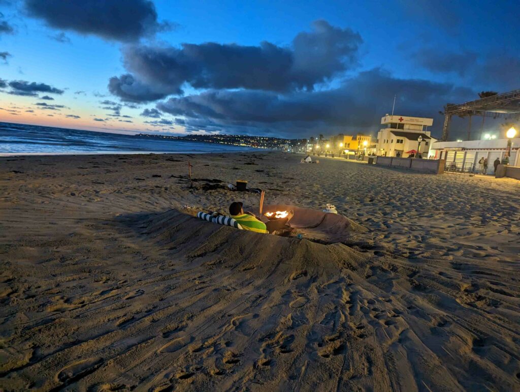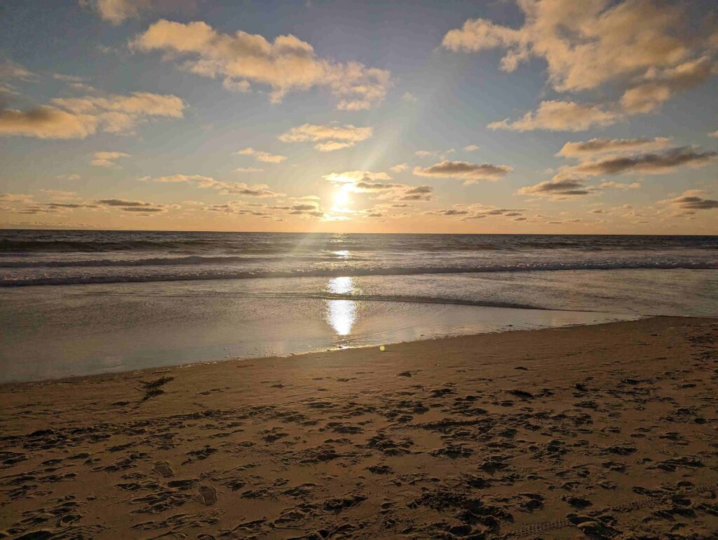 Am Strand ist es schön. Der Sonnenuntergang ist traumhaft und es gibt viel Interessantes zu beobachten. Als es zu kalt wird gehe ich zurück ins Hostel und schlafe 21 Uhr ein. Der Tag war aufregend und der Jetlag hat mich noch im Griff. Hoffentlich werden die nächsten Tage besser.